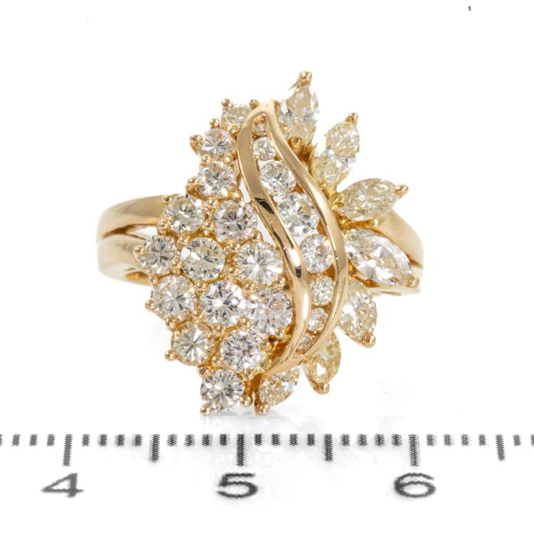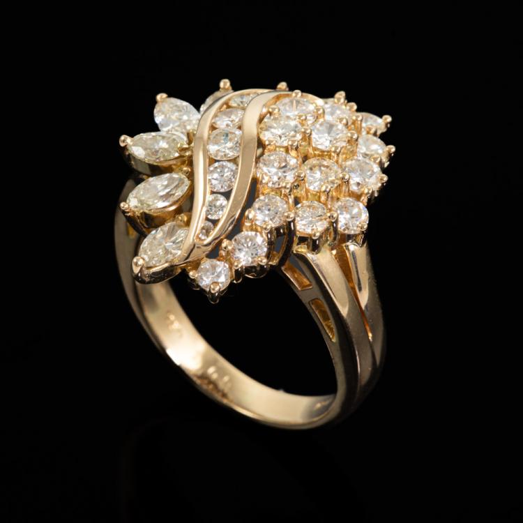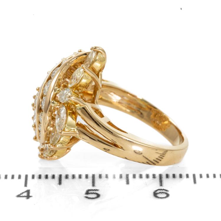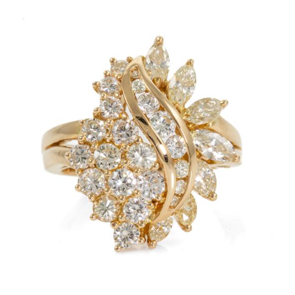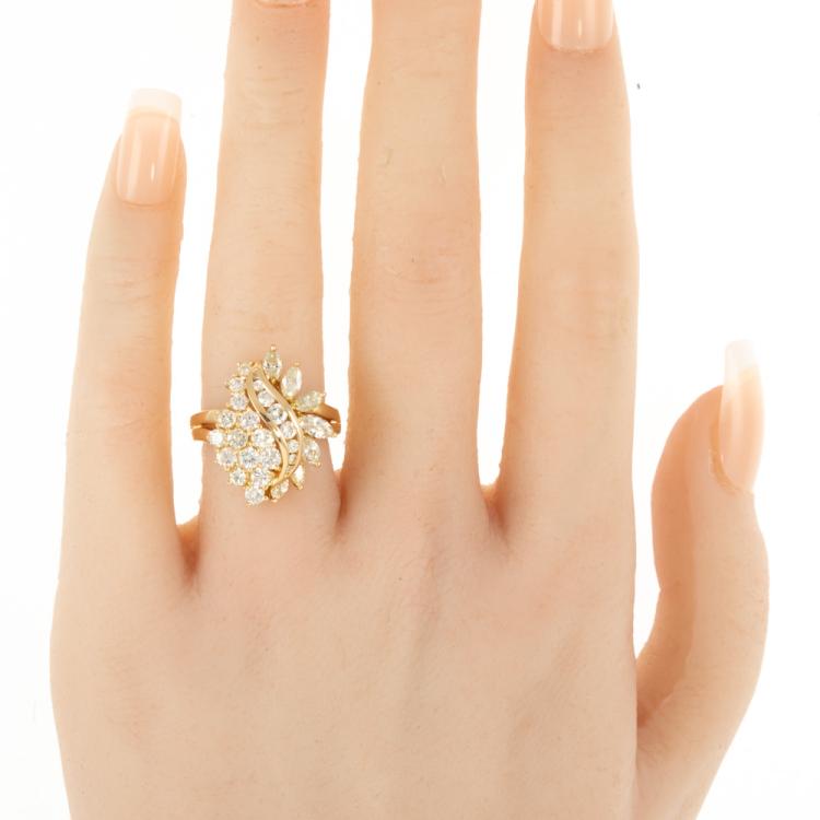 Diamond Dress ring with round & marquise cut Natural Diamonds totalling 1.65ct (Estimated grading: G-H SI & L-M SI). 18ct yellow gold. Ring size J. Band width: 3.8mm - 2.8mm. Weight: 7.4g. (Pre-owned).