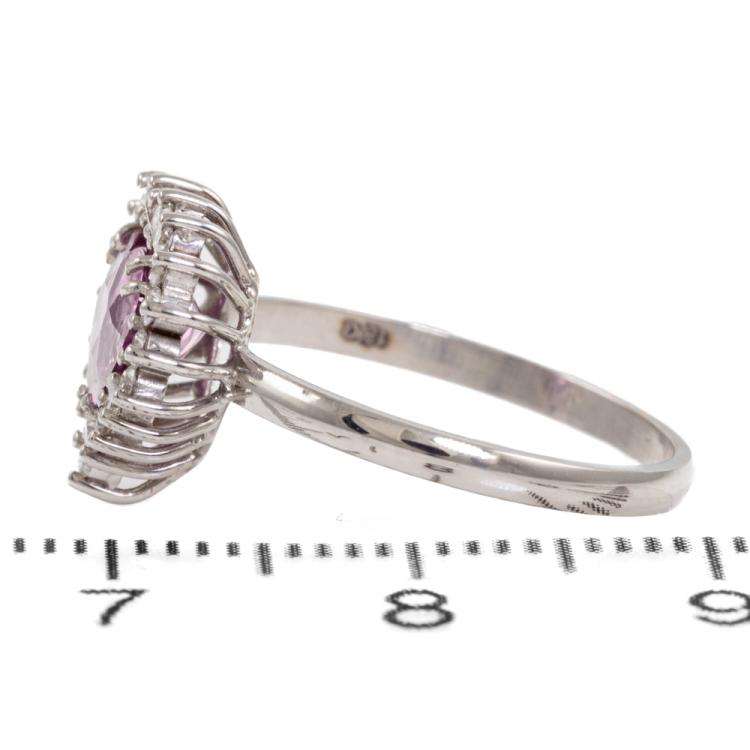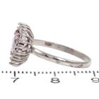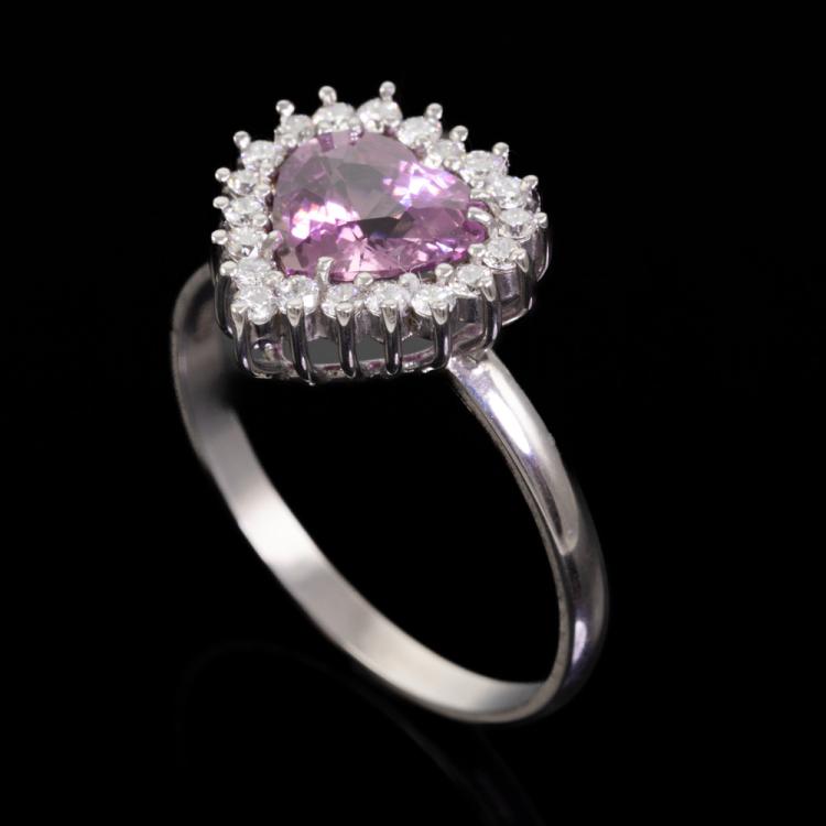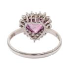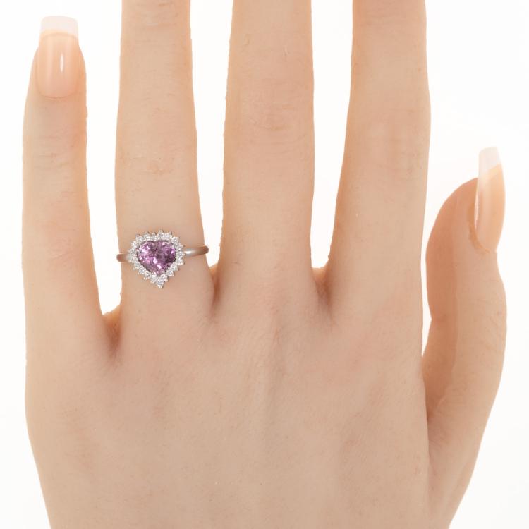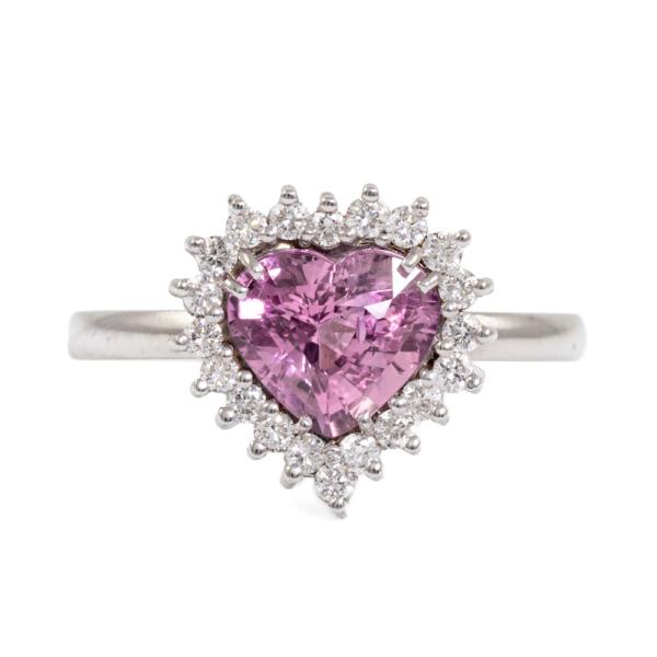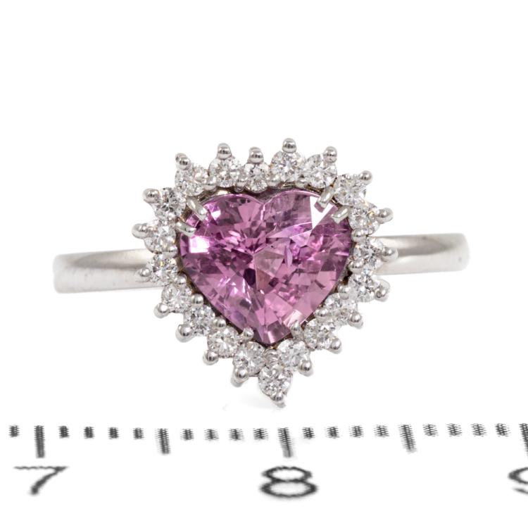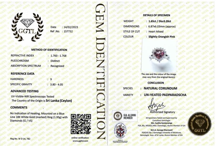 Sapphire and Diamond ring with heart shape natural unheated Ceylon Padparadscha Sapphire of 1.65ct and round Diamonds totalling 0.20ct. 18ct white gold. Ring size K. Band width: 1.7mm. Weight: 1.9g. With GGTL Certificate #157732. (As New)