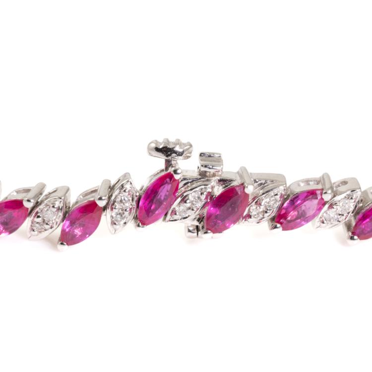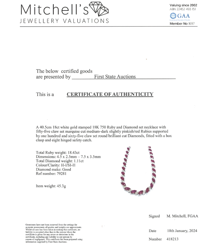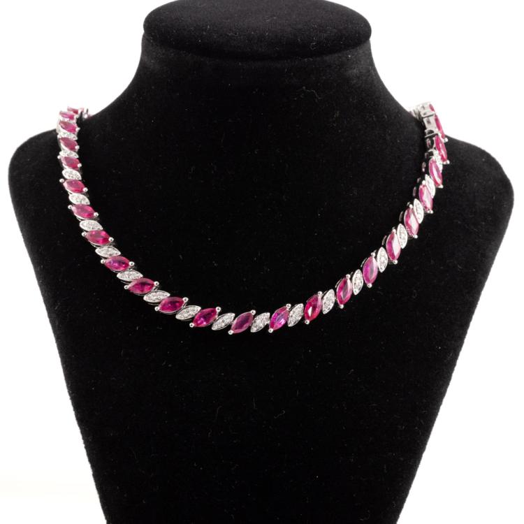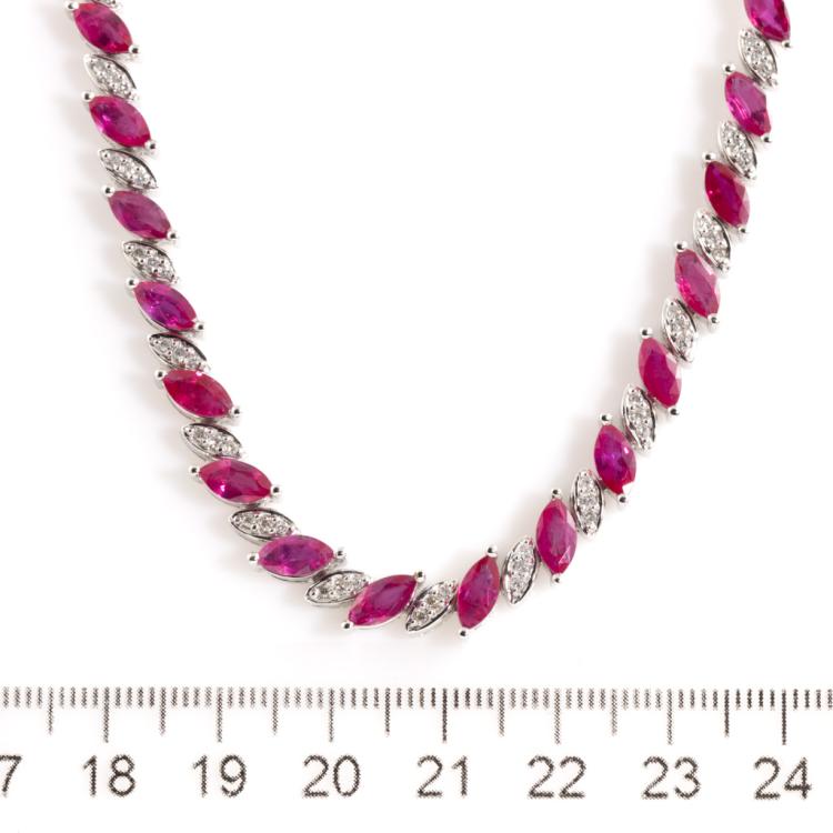 Ruby and Diamond necklace with marquise cut Natural Rubies totalling 18.43ct and round Natural Diamonds totalling 1.11ct (Estimated grading: H-I SI-P1). 18ct white gold. Length: 40.5cm. Weigh: 45.3g. With Certificate #418213. (Pre-owned)