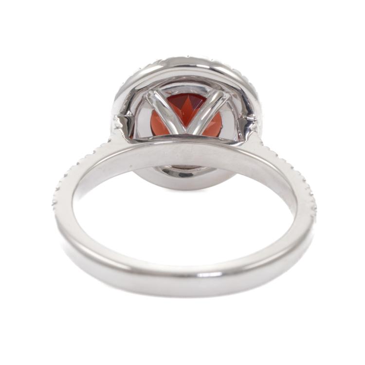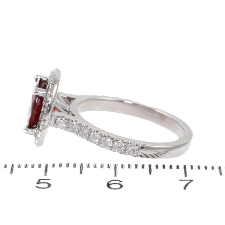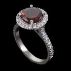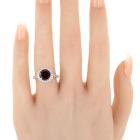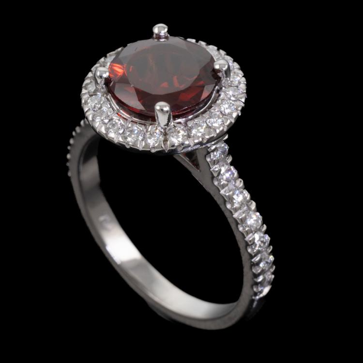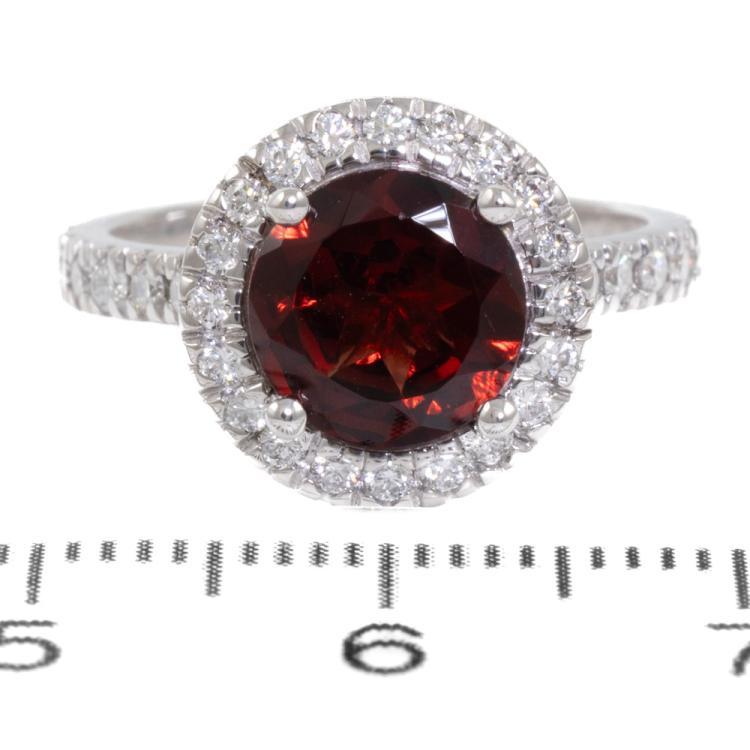 Garnet and Diamond halo ring with centre round red natural Garnet of 1.90ct and surrounding round Diamonds totalling 0.45ct (Estimated grading: G VS). 18ct white gold. Ring size K1/2. Band width: 2.1mm - 2.4mm. Weight 5.4g. (New)