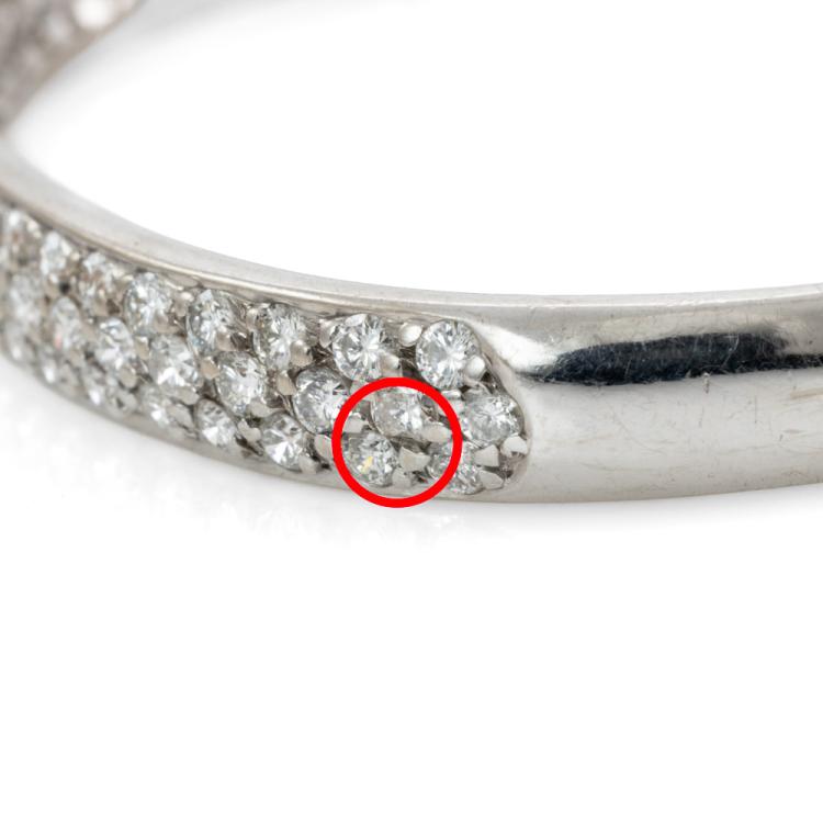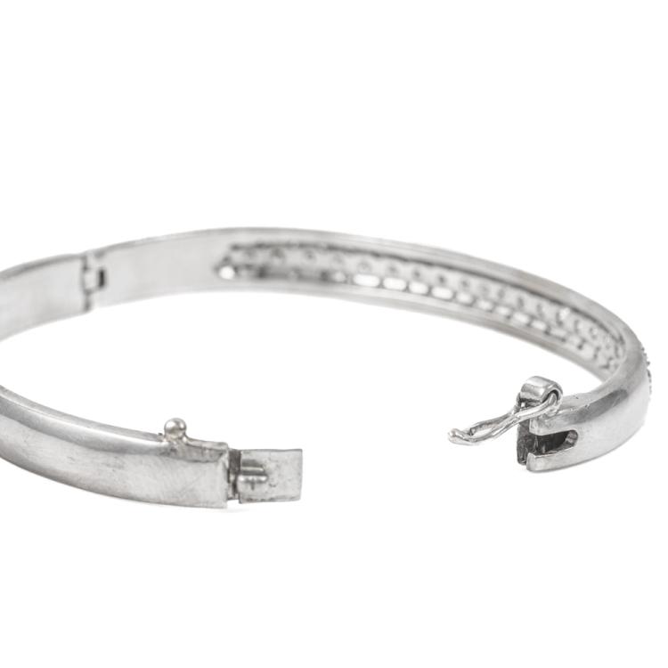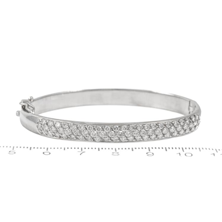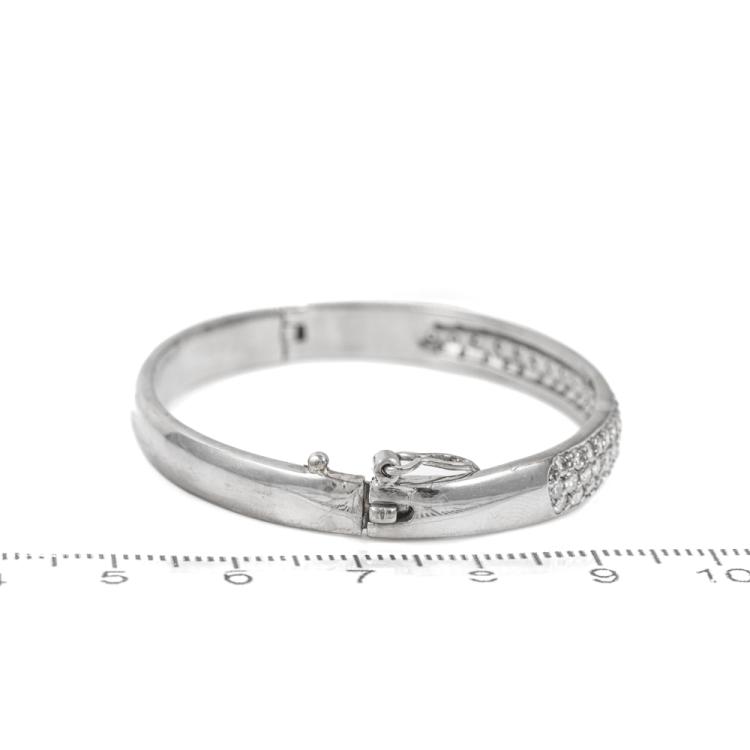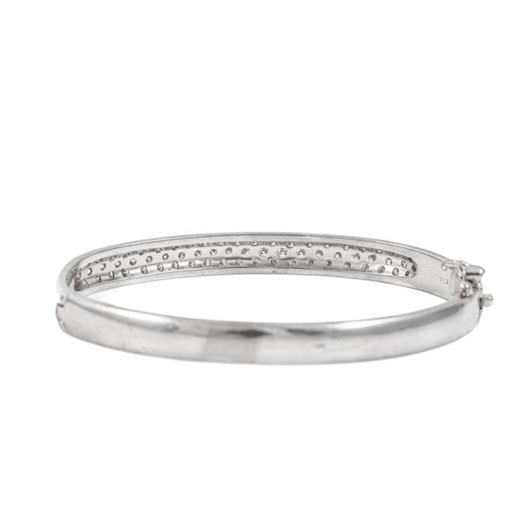 Diamond bangle with round natural Diamonds totalling approximately 2.00cts (Estimated grading: H-I SI, Note - 1 stone chipped). 18ct white gold. Width: 5.5mm - 6.2mm. Inner circumference: 14cm. Weight: 21.5g. (Pre-owned)