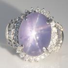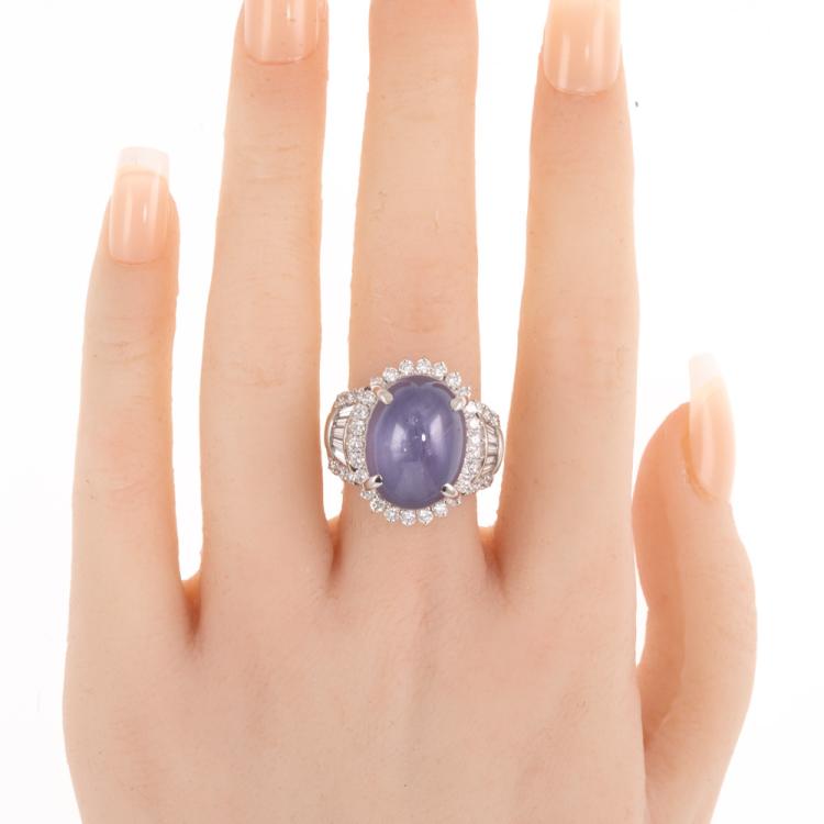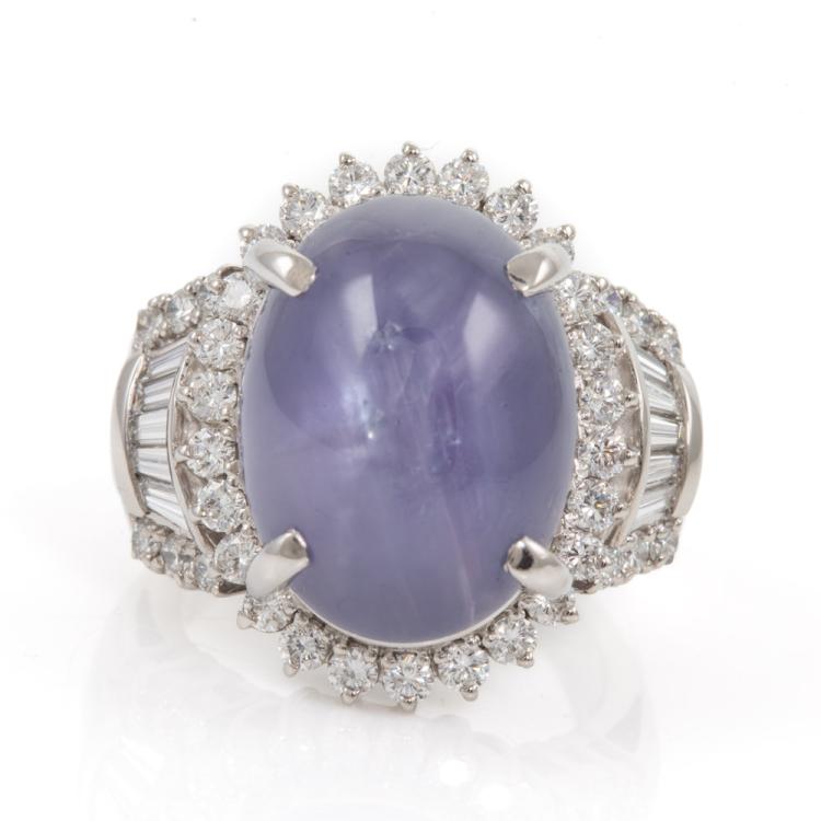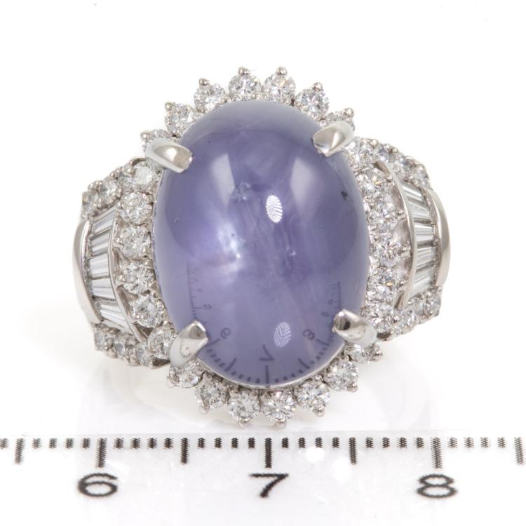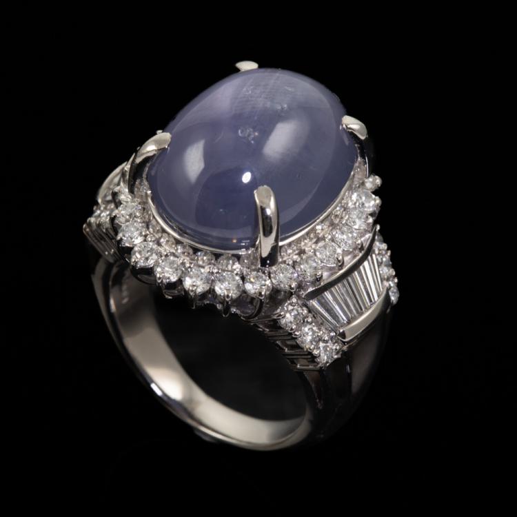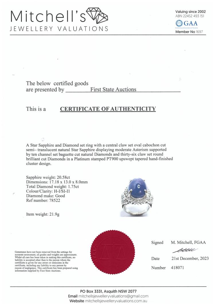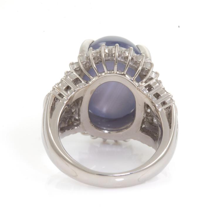 Sapphire and Diamond ring with oval cabochon cut blue Natural Star Sapphire of 20.58ct and round Natural Diamonds totalling 1.75ct (Estimated grading: G-H VS-SI). Platinum 900. Ring size M1/2. Band width: 8.1mm - 3.2mm. Weight: 23.6g. With Certificate #418071. (Pre-owned)
