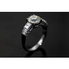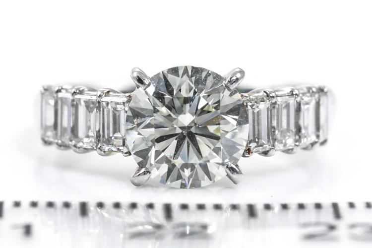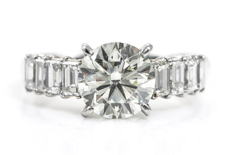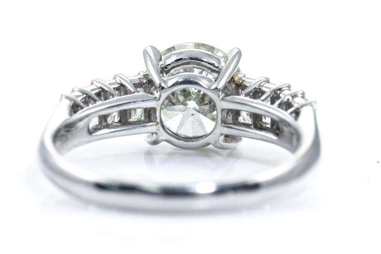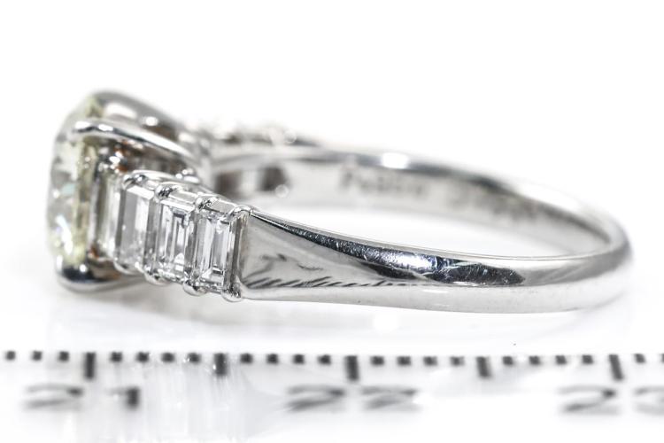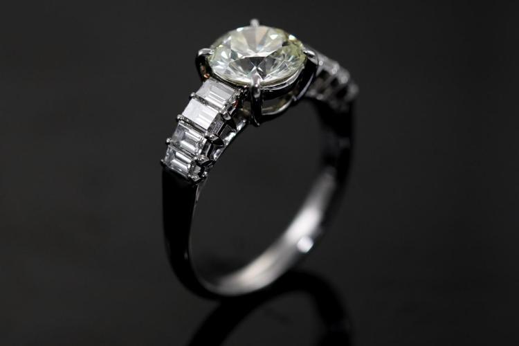 Diamond ring with a centre round brilliant cut Natural Diamond of 1.55ct (Estimated grading: N-O SI1) and 8 shoulder baguette cut Natural Diamonds totalling 0.77cts (Estimated grading: G SI). Platinum - 950. Ring size K. Weight: 4.7g. With Certificate #415340. (Pre-owned)