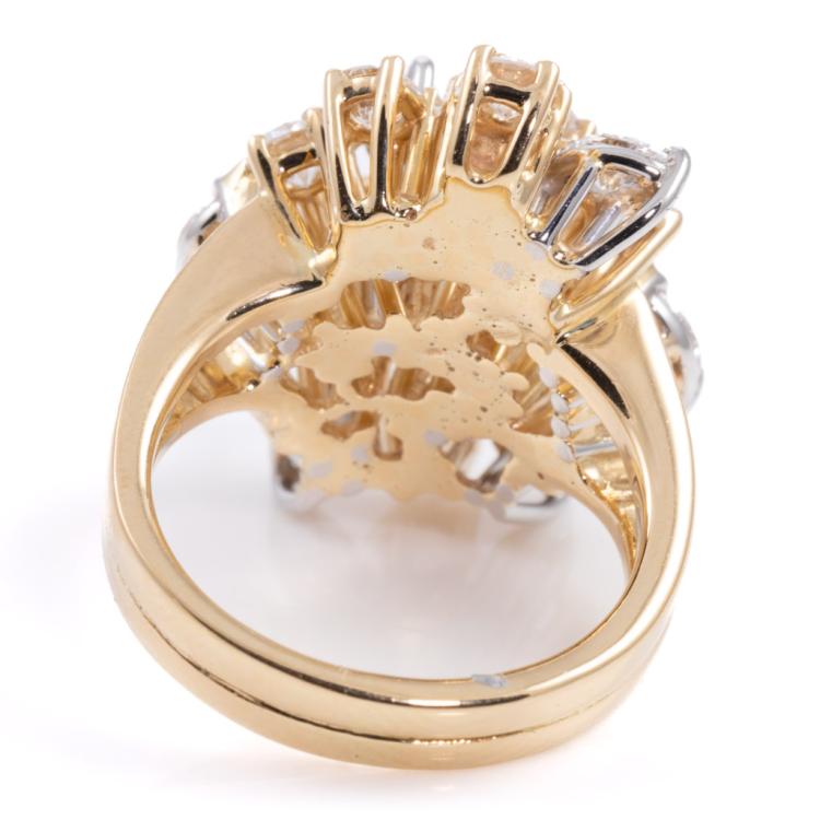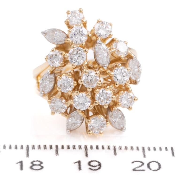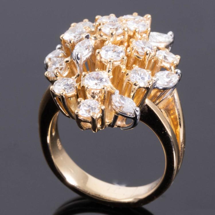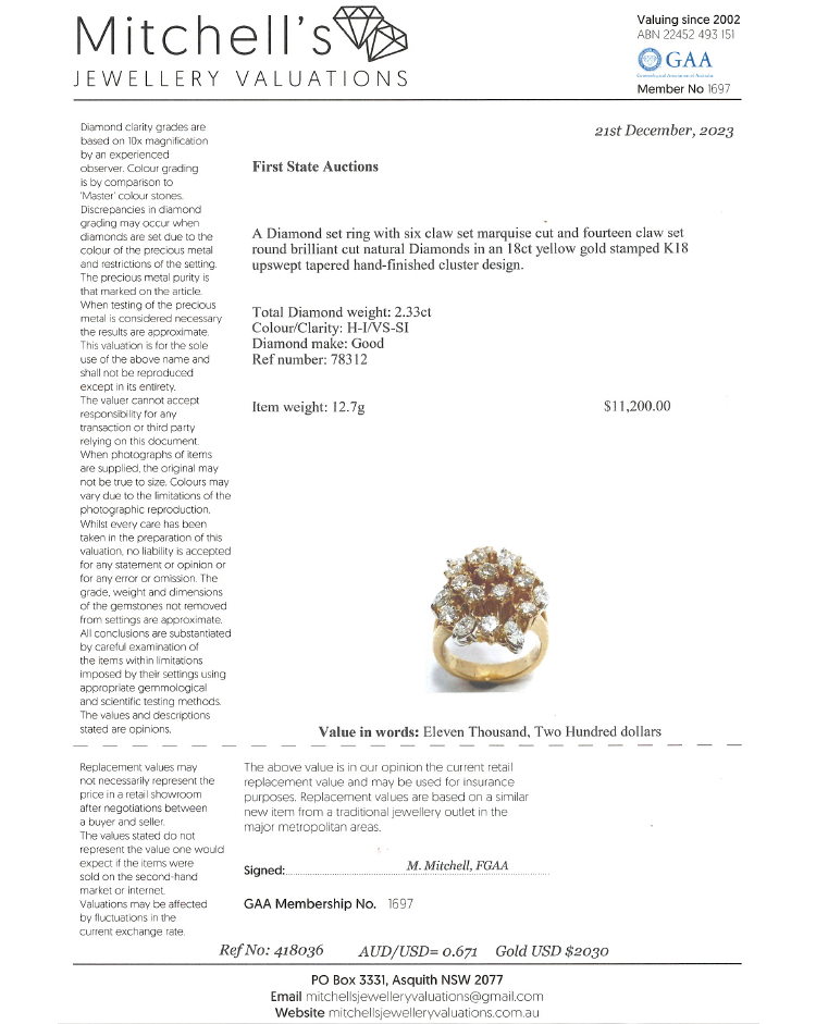 Diamond ring with round & marquise cut natural Diamonds totalling 2.33ct (Estimated grading: H-I VS-SI). 18ct yellow gold. Band width: 3.8mm-5.8mm. Ring size H1/2. Weight: 12.7g. With Valuation Certificate #418036. (Pre-owned)