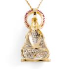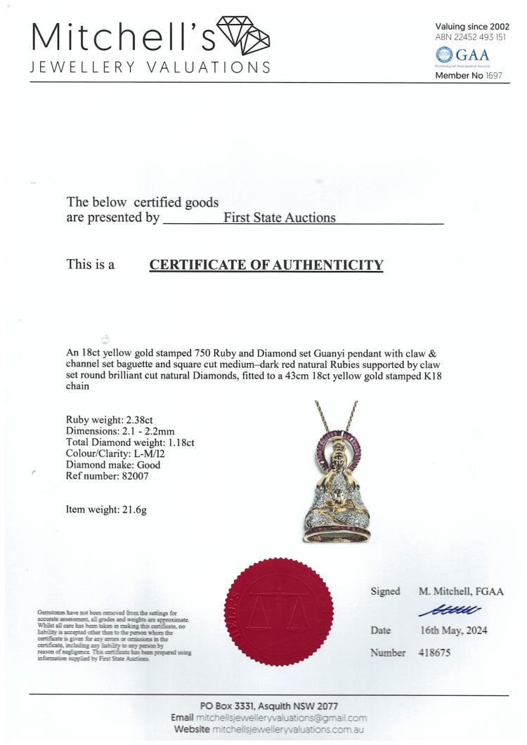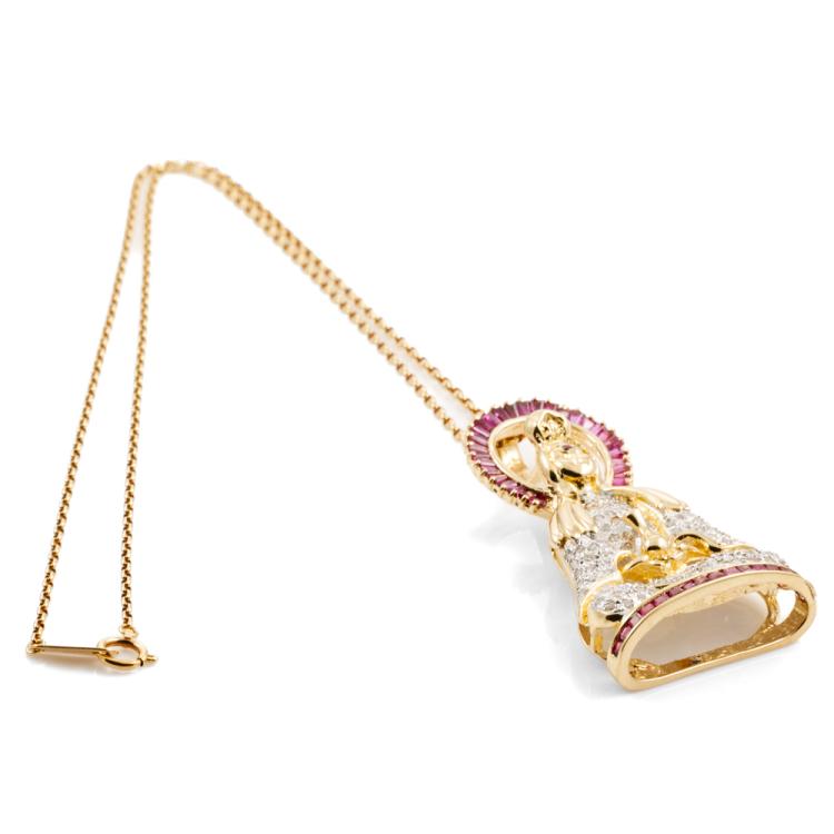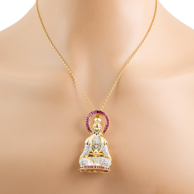 Ruby and Diamond Guanyin pendant with square and baguette cut natural Rubies totalling 2.38ct and natural round Diamonds totalling 1.18ct (Estimated grading: L-M P2). 18ct yellow gold with yellow gold 43cm chain. Pendant measurements: 48mm x 25mm. Weight: 21.6g. With Certificate. (Pre-owned)