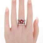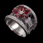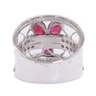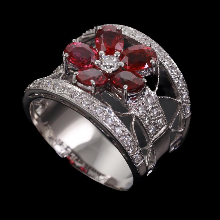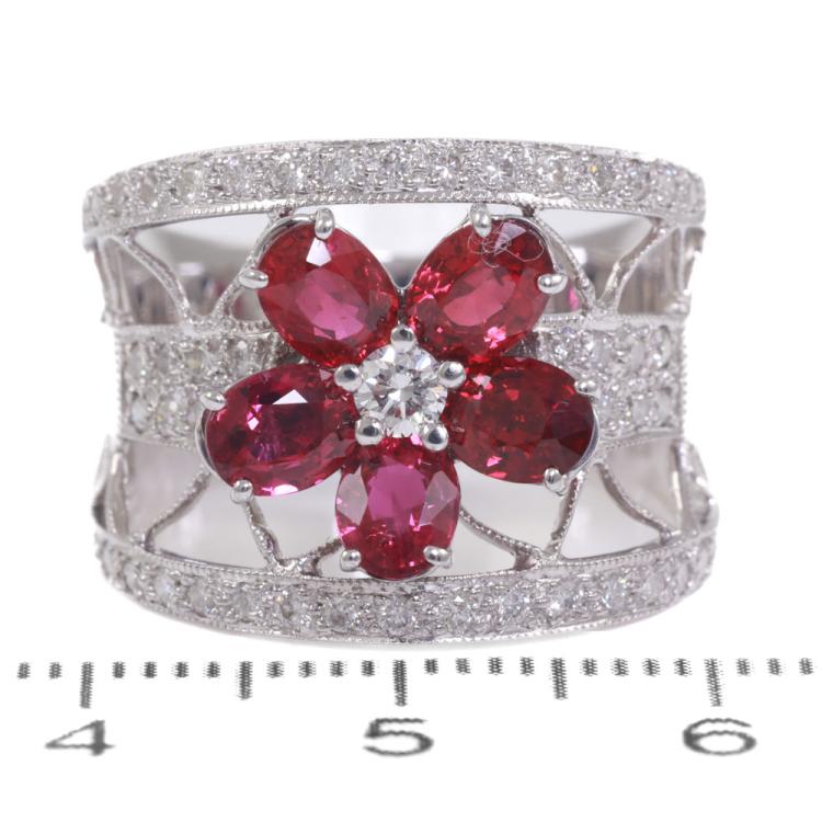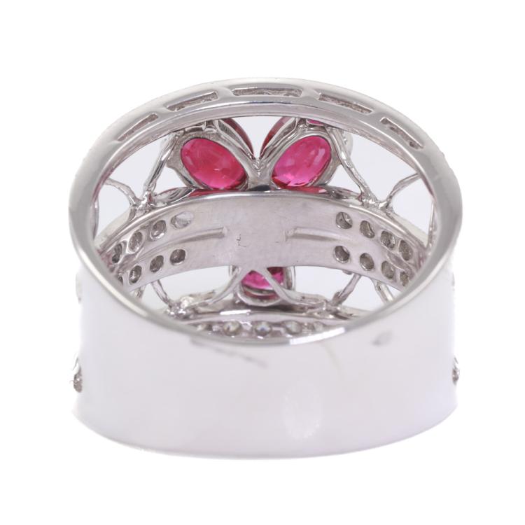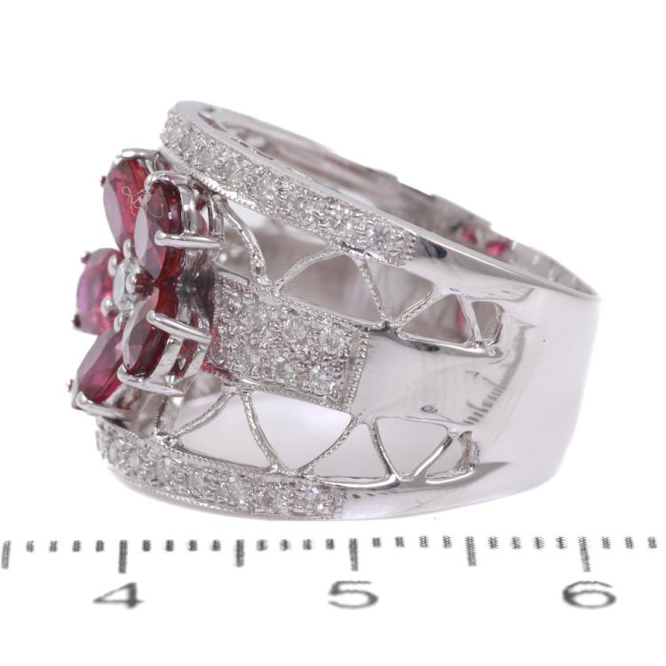 Ruby and Diamond ring with 5 oval Natural Ruby totalling 2.38ct and round Natural Diamonds totalling 0.57ct (Estimated grading: G VS-SI). 18ct white gold. Ring size O - ring resizing is not recommended. Weight: 9.4g (Pre-owned)