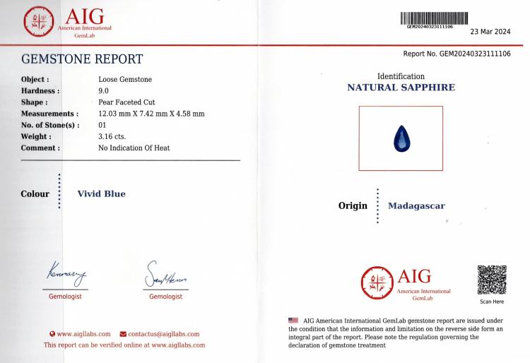 A Loose pear shape blue natural unheated Madagascan Sapphire of 3.16ct (with AIG Gemstones Report # GEM20240323111106). (As new)