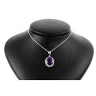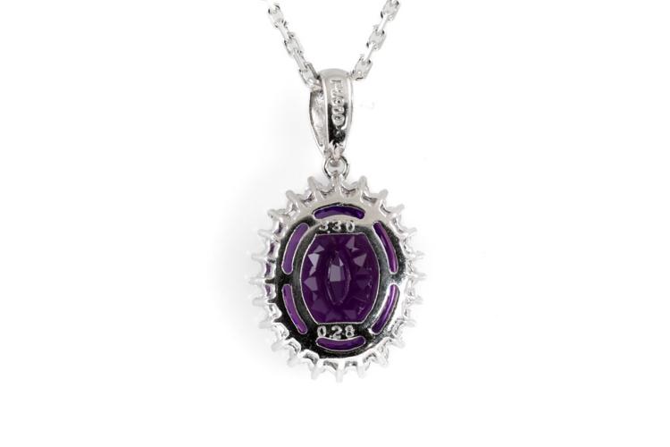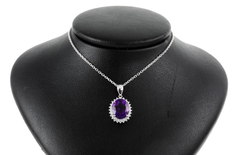 Amethyst and Diamond pendant with oval shape natural Amethyst of 3.30ct and round natural Diamonds totalling 0.28cts. Platinum-900 with 40cm 18ct white gold chain. Weight: 6.0g. (Pre-owned)