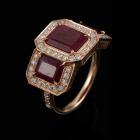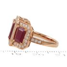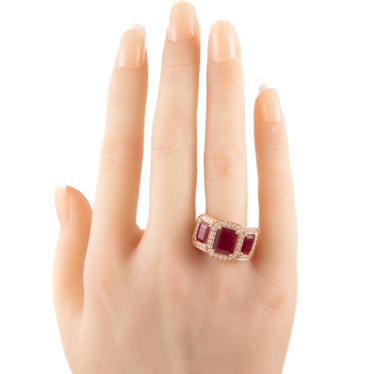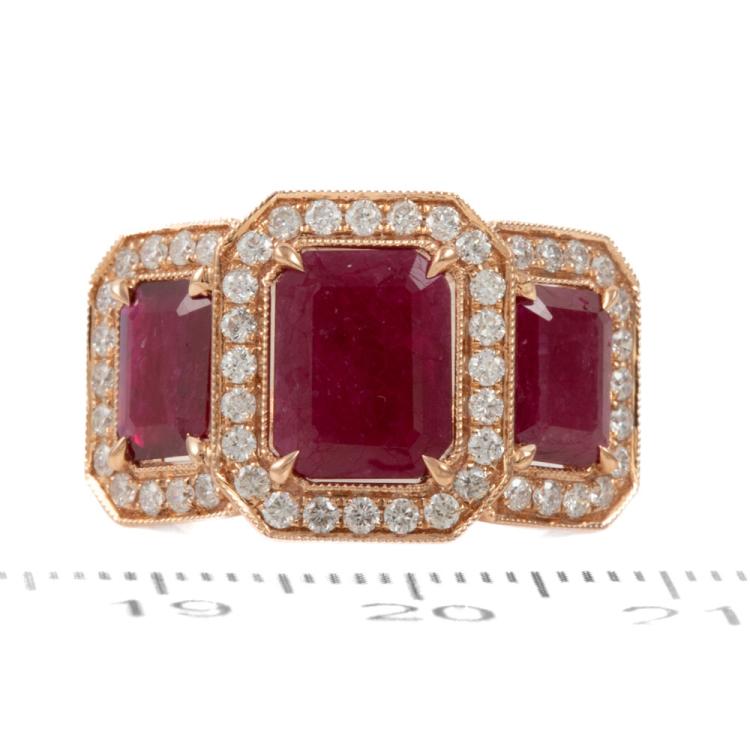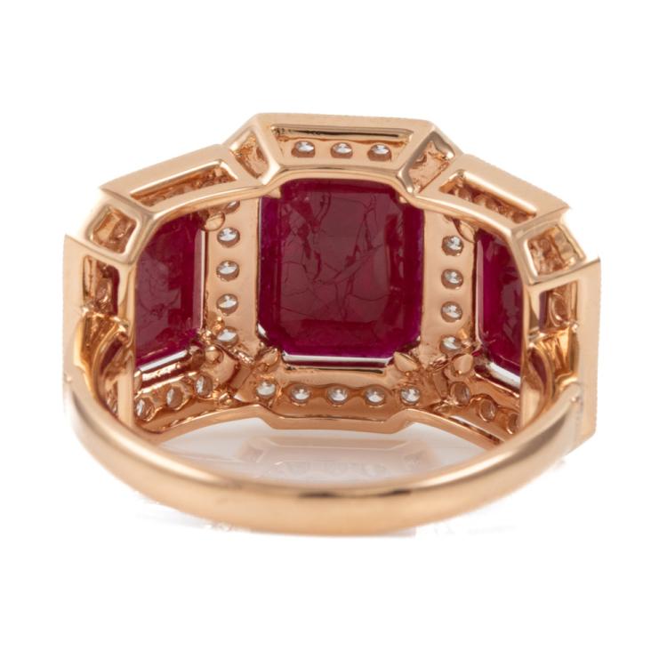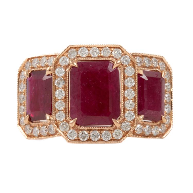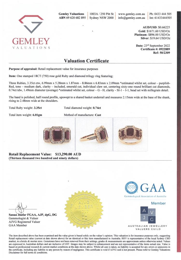 Ruby and Diamond ring with 3 emerald cut Natural Rubies totalling 3.35ct and round Natural Diamonds totalling 0.74ct (Estimated grading: G-H SI-P1). 18ct rose gold. Ring size N1/2. Band width: 2.2mm. Weight: 6.0g. With Valuation #0922889. With Valuation Certificate #419187. (Pre-owned)