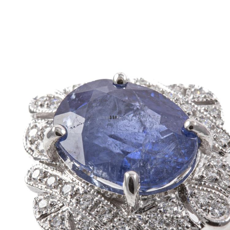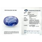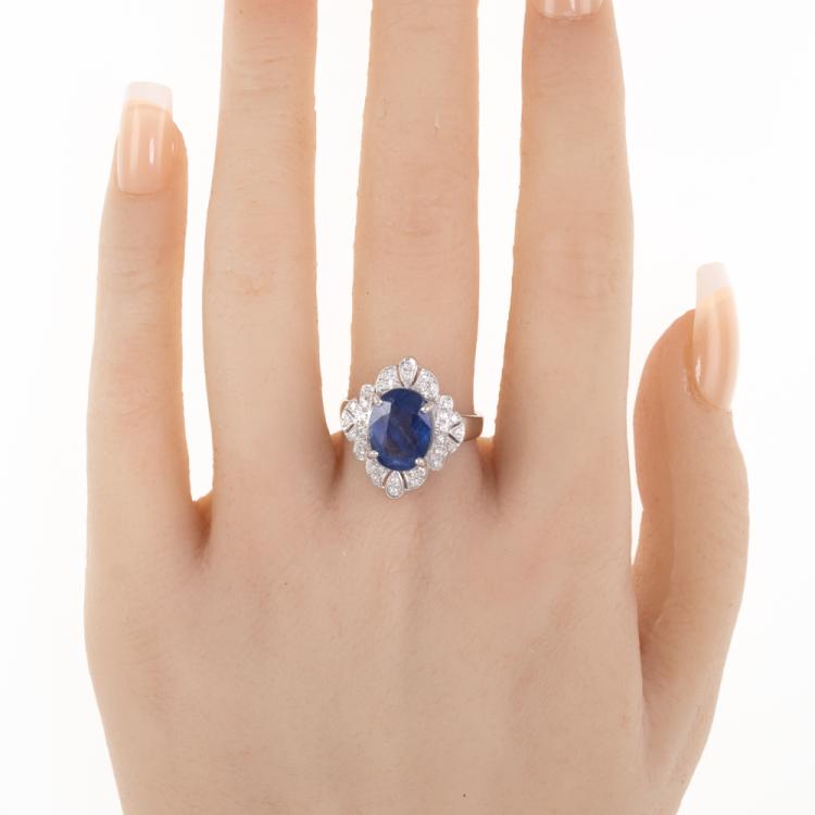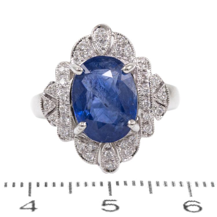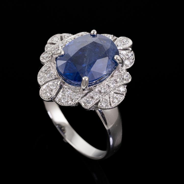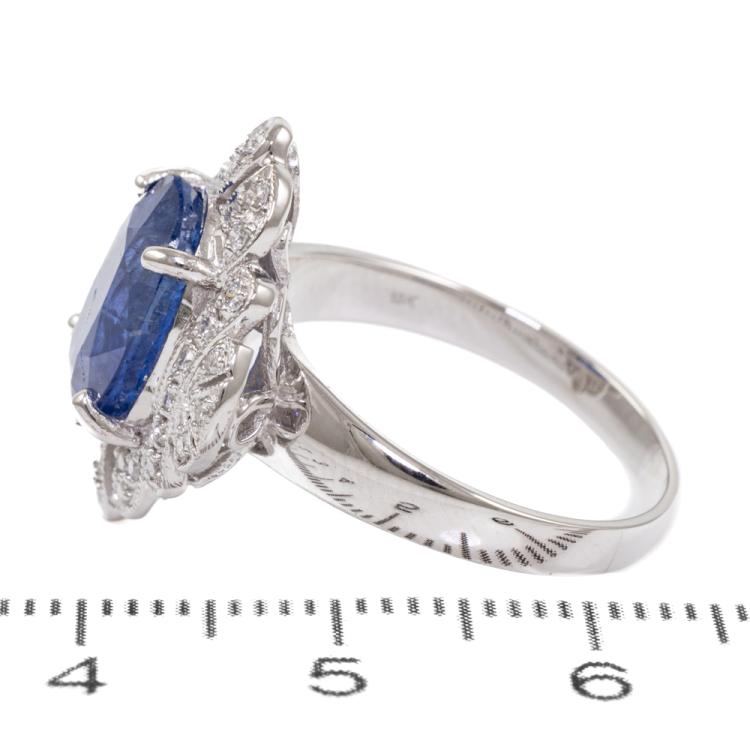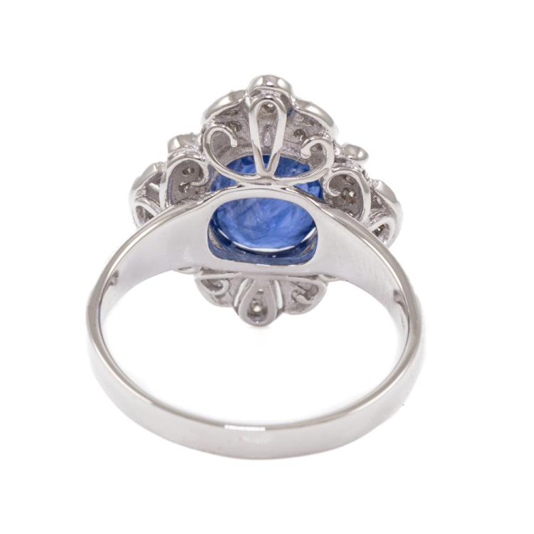 Sapphire and Diamond ring with oval Natural Ceylon blue Sapphire of 4.46ct (With GSL Summary Report #AA68791/1) and round Natural Diamonds totalling approximately 0.17ct. 18ct white gold. Ring size: O. Band width: 2.5mm - 3.5mm. Weight: 6.1g. (As new)