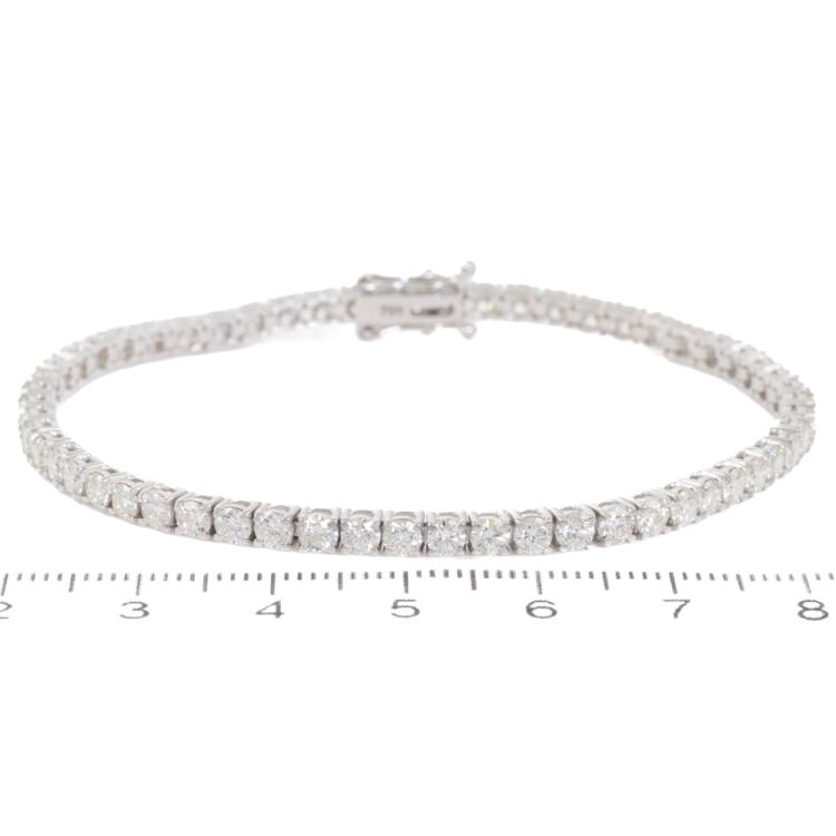 Diamond tennis bracelet with 57 round brilliant cut Natural Diamonds totalling 5.93ct (Estimated grading: I-J VS). 18ct white gold. Length: 18.5cm. Weight: 10.7g. With Valuation Certificate #418871. (New)