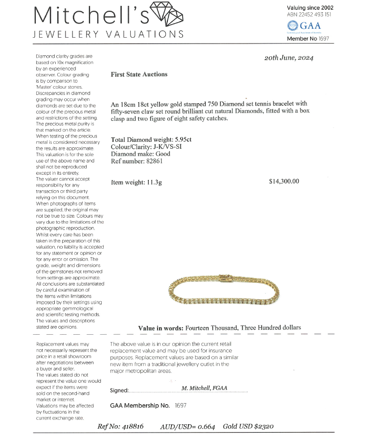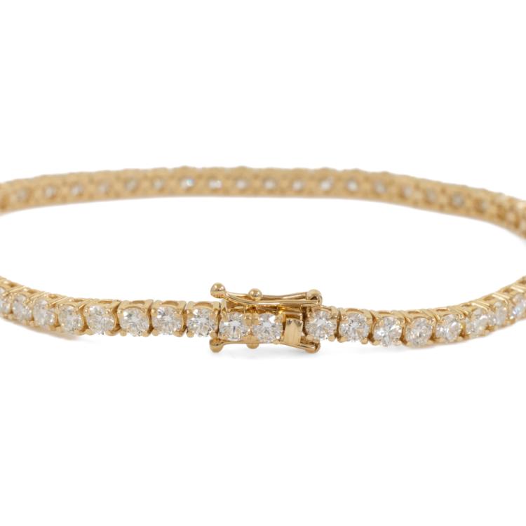 Diamond tennis bracelet with 57 round Natural Diamonds totalling 5.95ct (Estimated grading: J-K VS-SI). 18ct yellow gold. Length: 18cm. Weight: 11.3g . With Valuation Certificate #418816. (New)