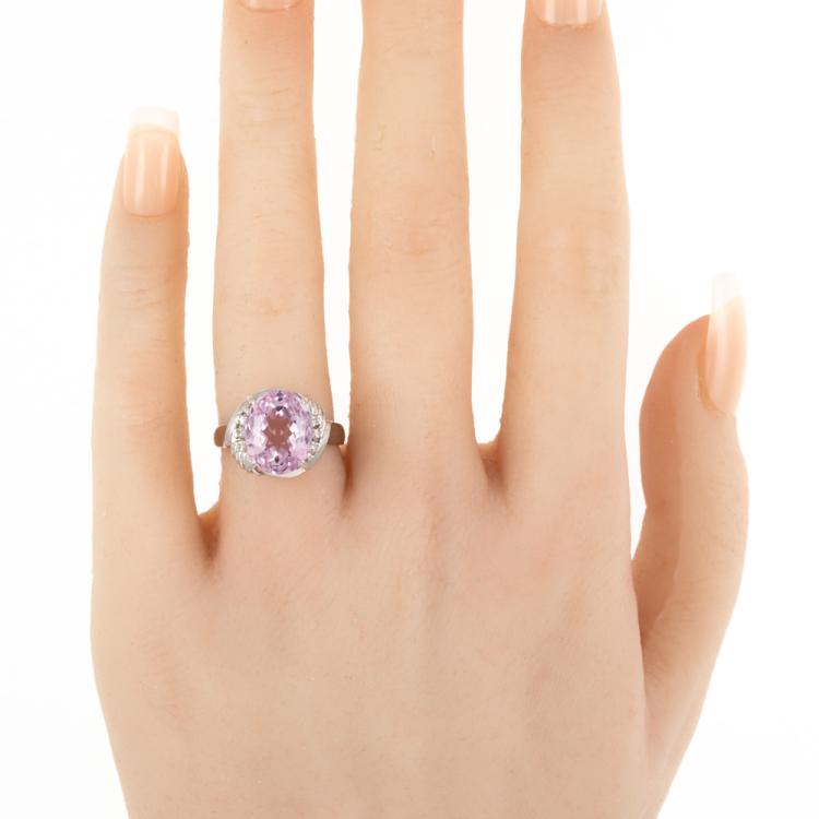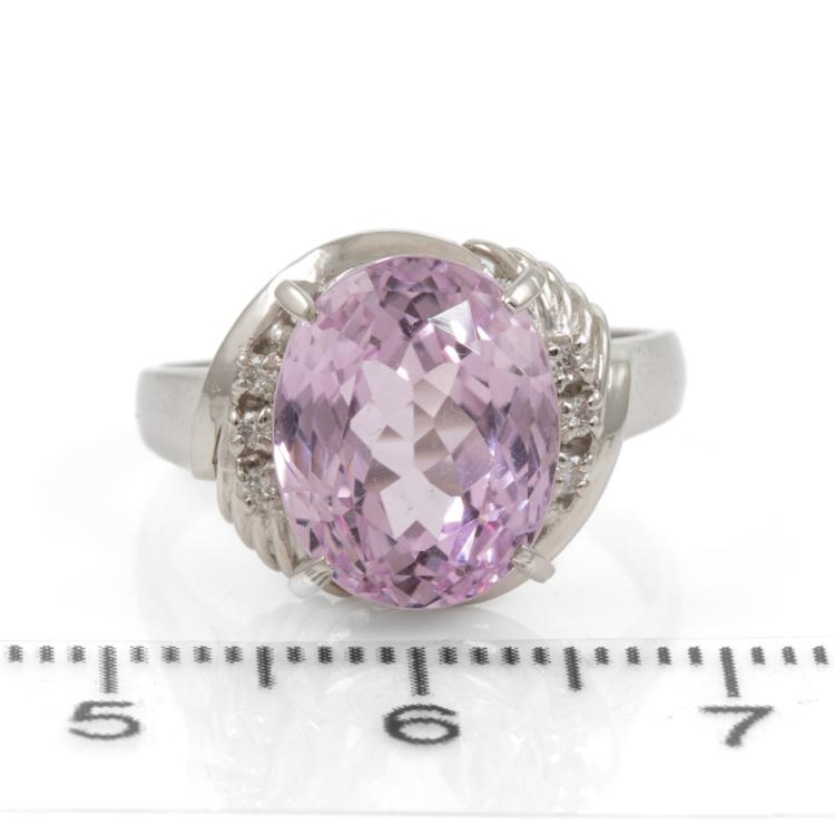 Kunzite and Diamond ring with oval shape checkerboard cut Natural Kunzite of 6.00ct and round Natural Diamond totalling 0.06ct. Platinum 900. Ring size L. Band width: 2.40mm - 3.50mm. Weight: 6.9g. (Pre-owned)