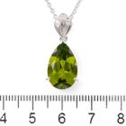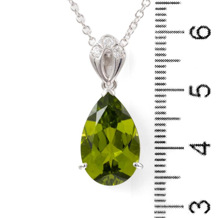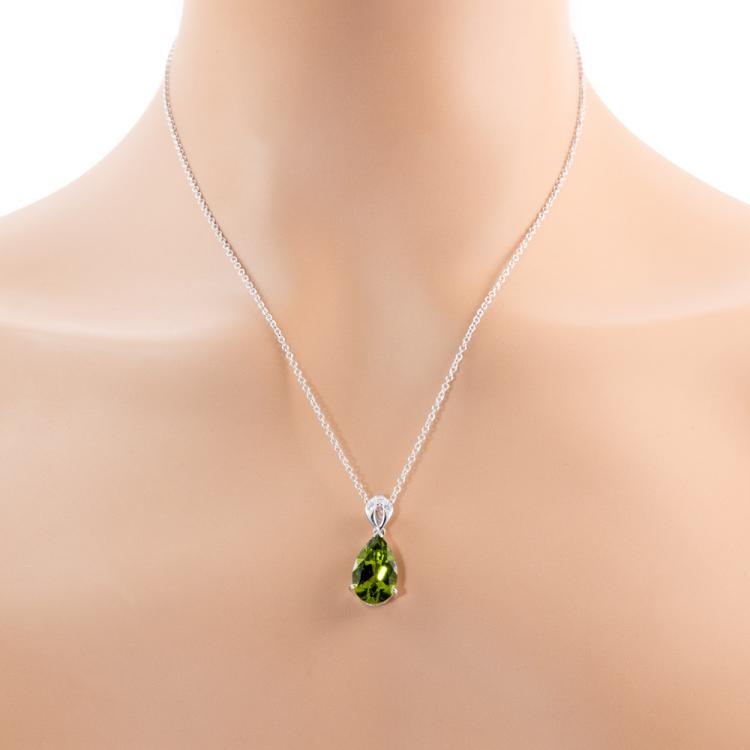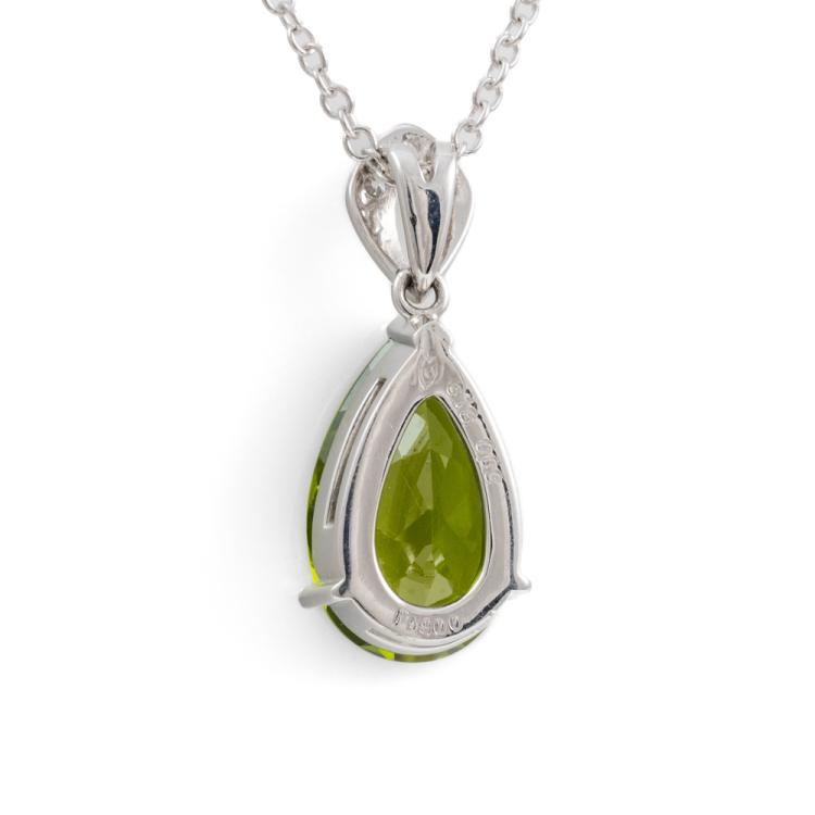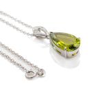 Peridot and Diamond pendant with pear shape natural Peridot of 6.18ct and round natural Diamond totalling 0.09ct. Platinum-900 with 18ct gold 45cm chain. Weight: 7.6g. (Pre-owned)