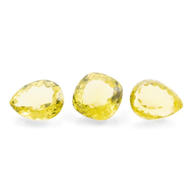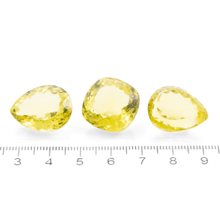 A parcel of 3 Loose Mixed Shape Lemon Quartz totalling 70.24ct. 1 pear shape natural Lemon Quartz of 24.19ct (approx. size: 21.15mm x 16.34mm x 10.91mm) and 1 cushion cut natural Lemon Quartz of 24.68ct (approx. size: 18.32mm x 18.28mm x 12.04mm) and 1 pear shape natural Lemon Quartz of 21.37ct (approx. size: 20.48mm x 16.57mm x 11.85mm). (New)