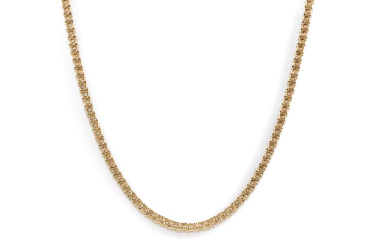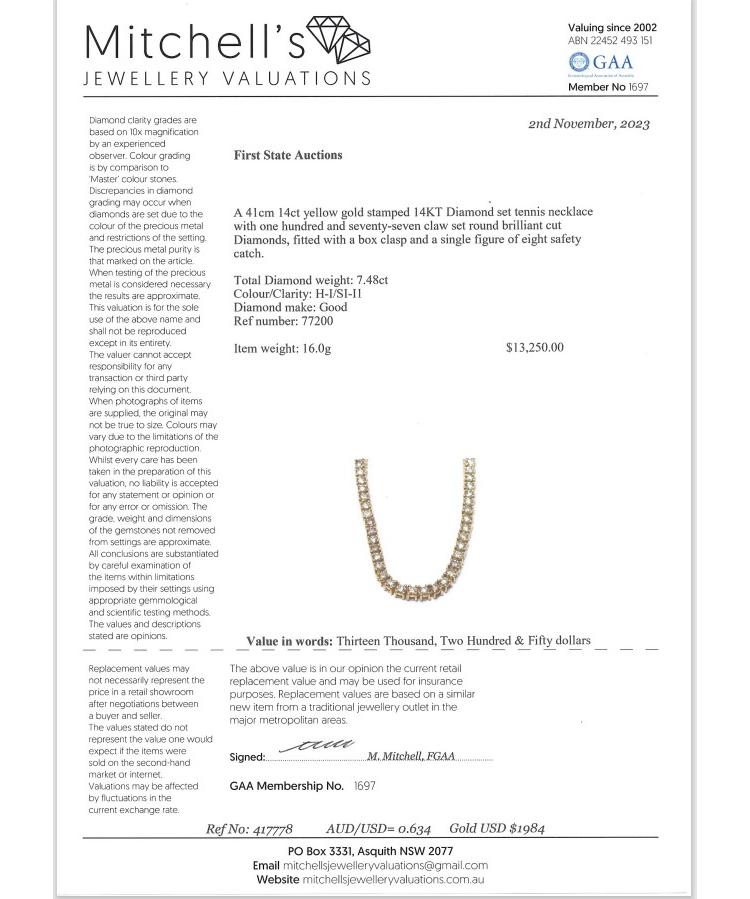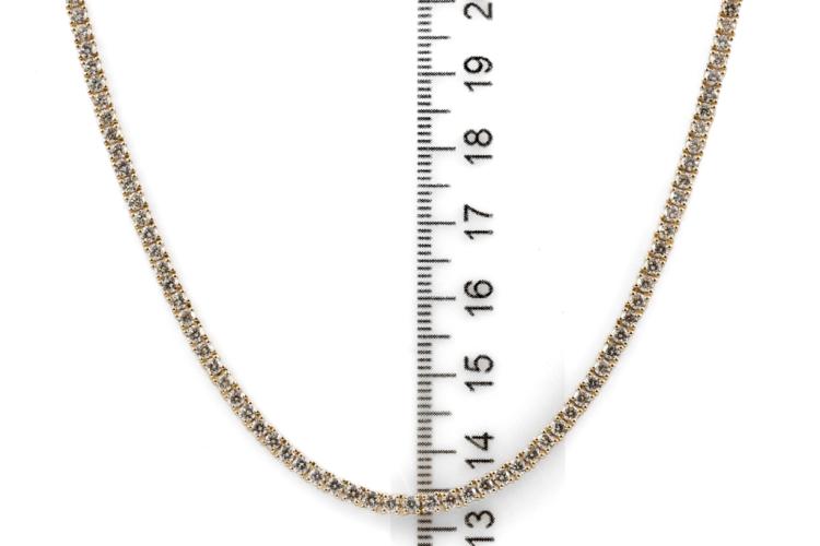 Diamond tennis necklace with 177 round Natural Diamonds totalling 7.48ct (Estimated grading: H-I SI-P1). 14ct yellow gold. Length: 41cm. Weight: 16.0g. With Valuation Certificate #417778. (New)