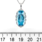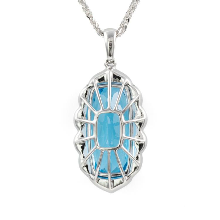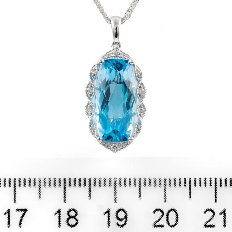 Topaz and Diamond pendant with rectangular cushion blue natural Topaz totalling 7.59ct (16.2mm x 8.2mm) and natural Diamonds totalling 0.12ct. 14ct white gold with 18ct white gold 45cm chain. Weight: 6.3g. (New)