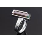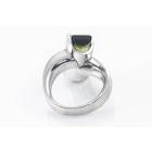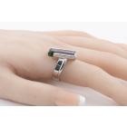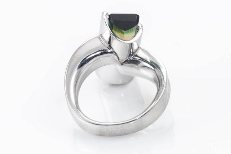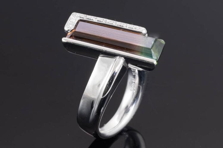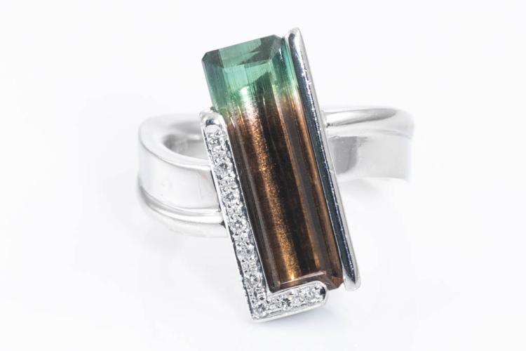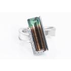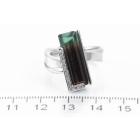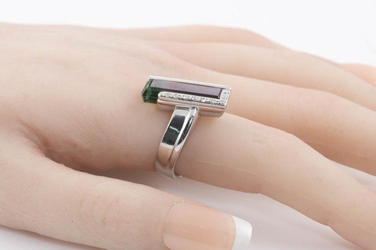 Tourmaline and Diamond ring with watermelon emerald cut Natural Tourmaline of 8.33ct and Natural Diamonds totalling 0.08ct. Platinum-900. Ring size L - ring resizing is not recommended. Weight: 18.9g. (Pre-owned)