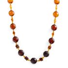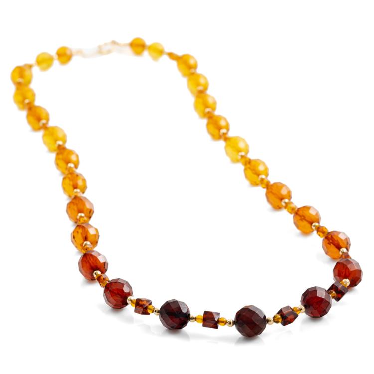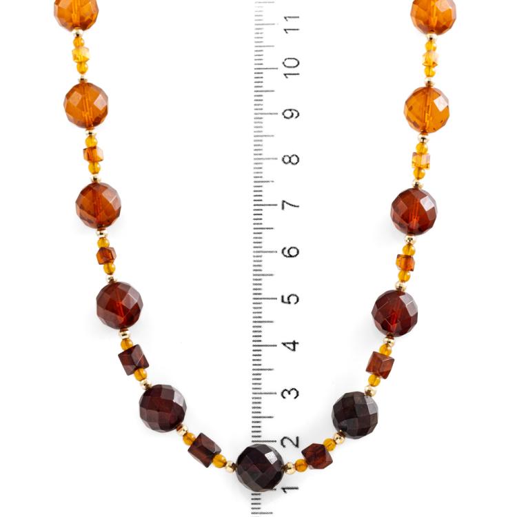 Amber necklace with round & square Natural Amber stones of 9.5mm and 2.4mm and gold beads. 18ct yellow gold clasp. Length: 59cm. Weight: 15.2g. (Pre-owned)