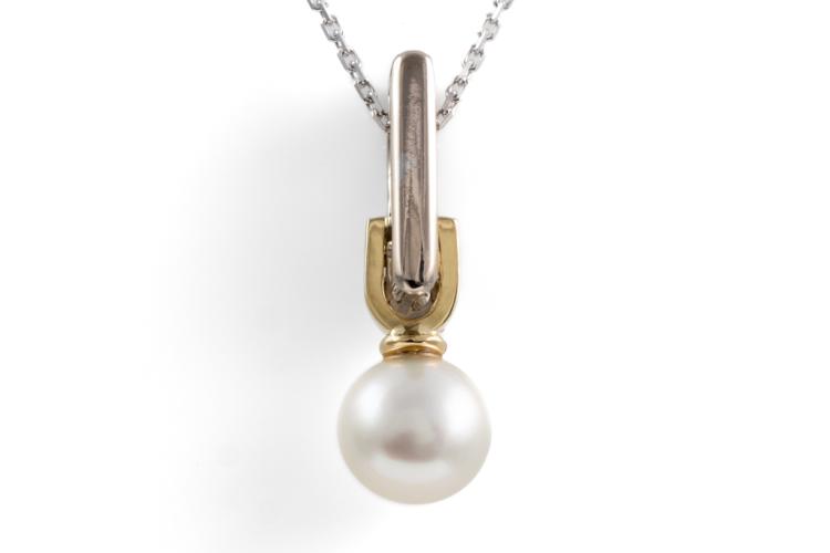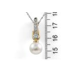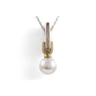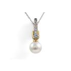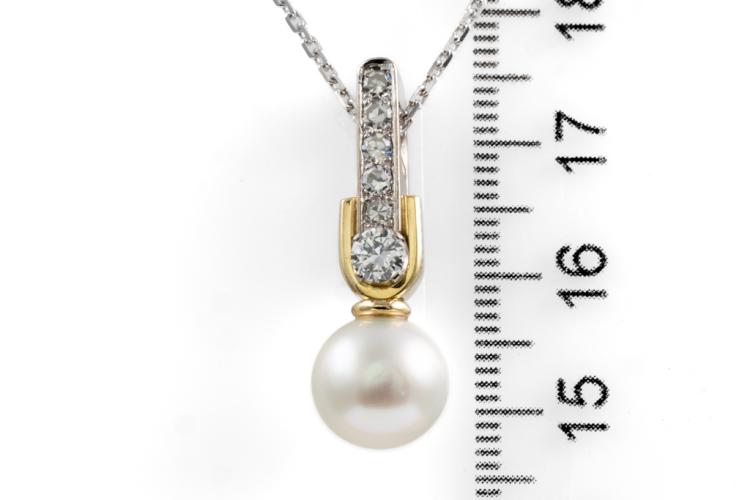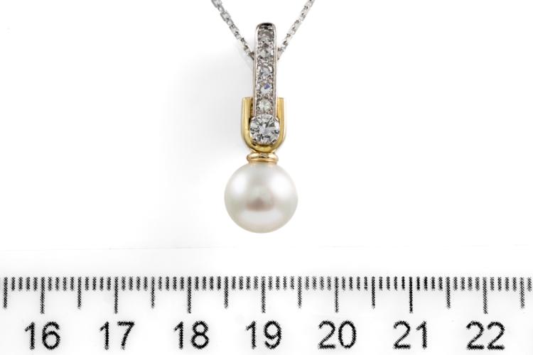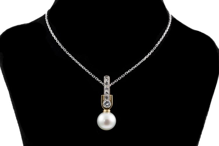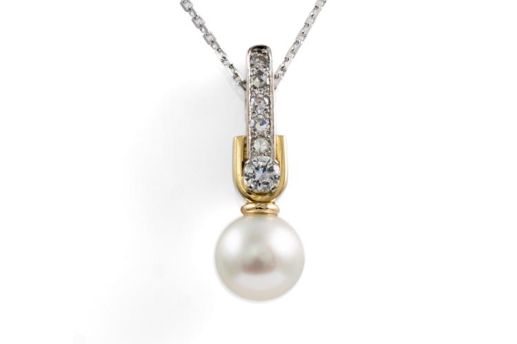 Pearl and Diamond enhancer pendant with a button shape cultured Pearl of 9.8mm and round Natural Diamonds totalling 0.45ct (Estimated grading G-H VS-SI). 18ct yellow and white gold with 45cm 18ct white gold chain. Weight: 8.9g. (Pre-owned)