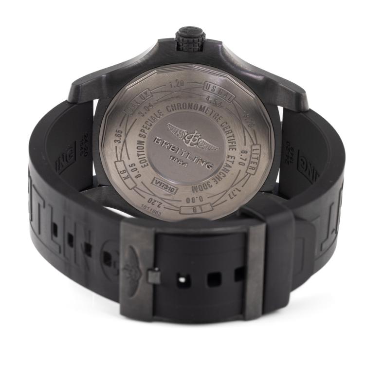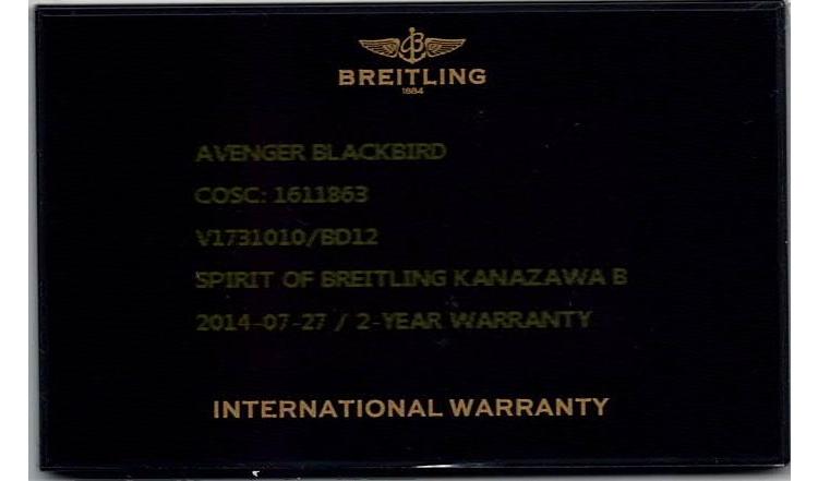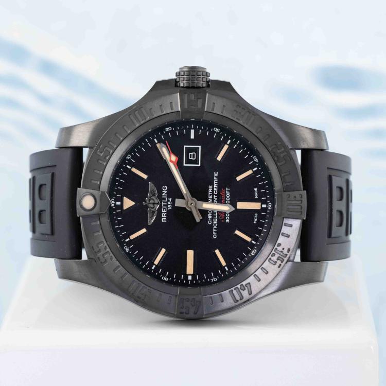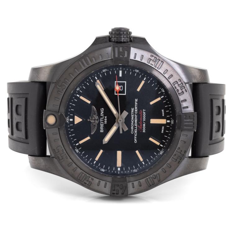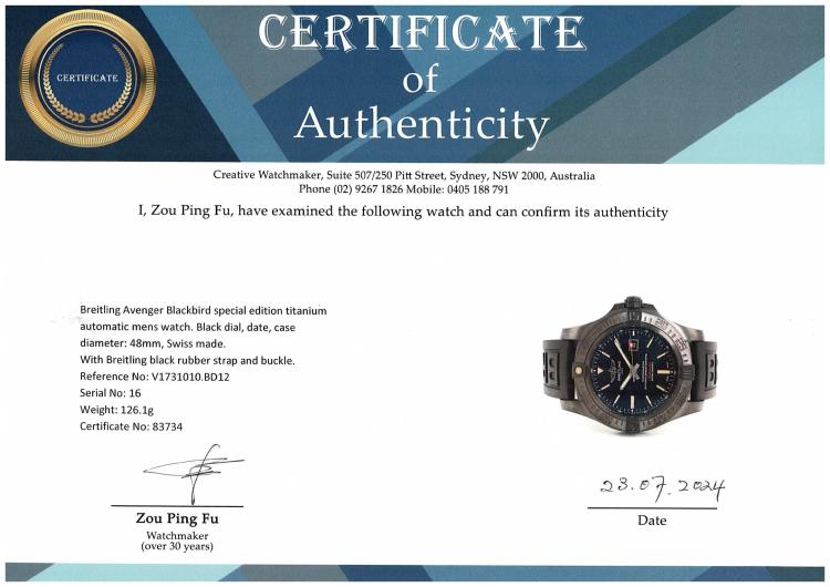 Breitling Avenger Blackbird special edition titanium automatic mens watch. Black dial, date, case diameter: 48mm, strap length: 24cm, Swiss made. Ref# V1731010.BD12. With Breitling black rubber strap and buckle. With Certificate of Authenticity, Breitling International E-warranty card dated 27/07/2014 and Breitling box. 3 month FSA warranty (Pre-owned)