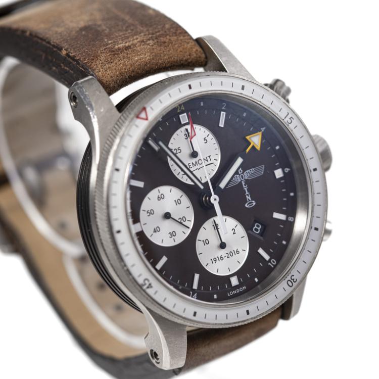 Bremont Boeing 100 Special Edition of 300 titanium automatic mens watch. Brown chronograph dial, date, case diameter: 43mm, strap length: 20.5cm, Made in UK. Ref# Boeing 100. With Bremont brown leather strap and buckle. With Certificate of Authenticity, Bremont COSC & Warranty Registration booklet dated 03/09/2016 and Bremont box. 3 month FSA warranty (Pre-owned)