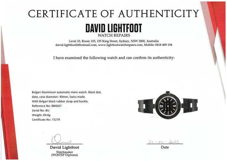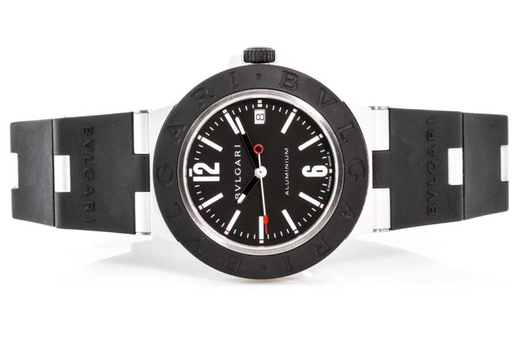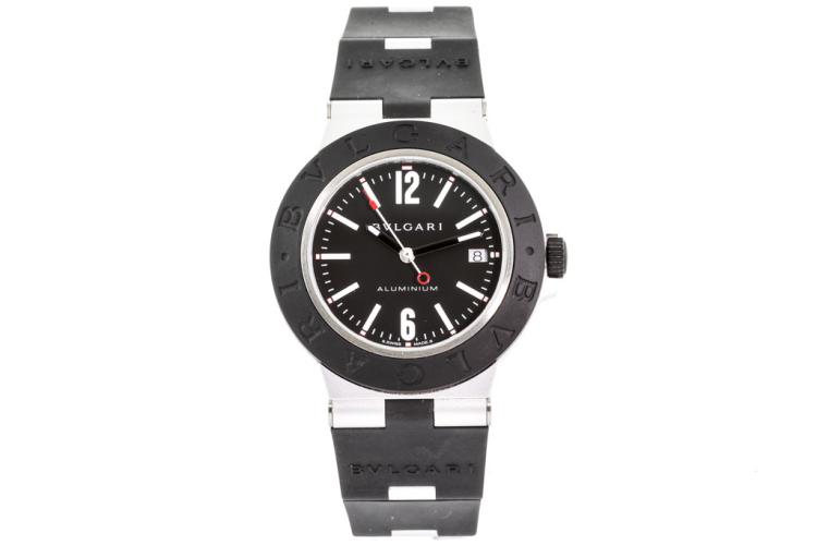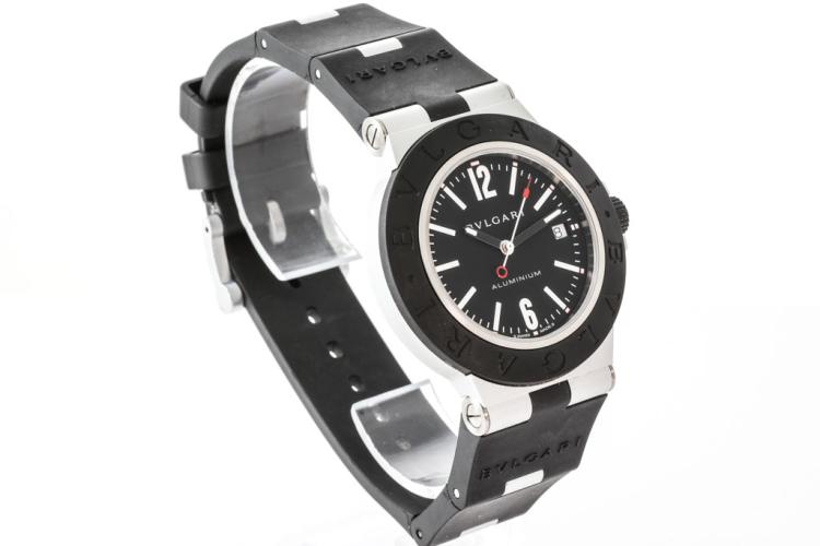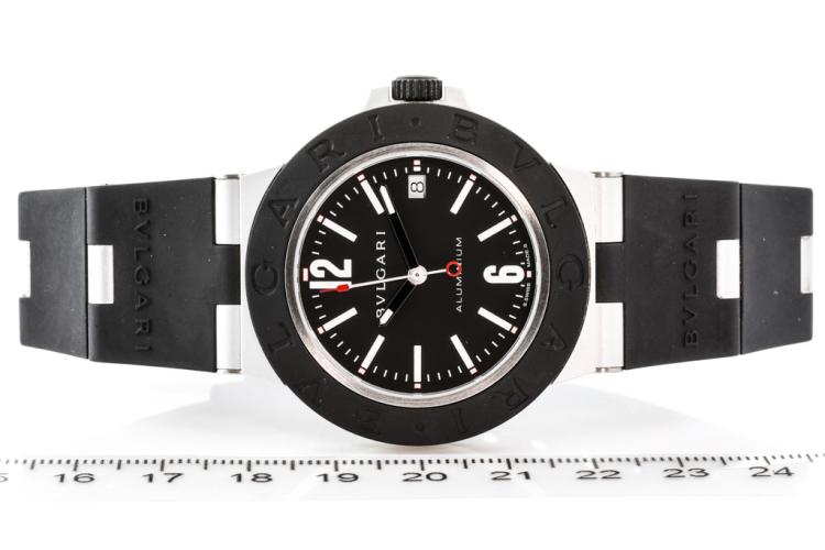 Bvlgari Aluminium automatic mens watch. Black dial, date, case diameter: 40mm, strap length: 21.5cm, Swiss made. Ref# BB40AT. With Bvlgari black rubber strap and buckle. With Certificate of Authenticity and Bvlgari pouch. 3 month FSA warranty. (Pre-owned)