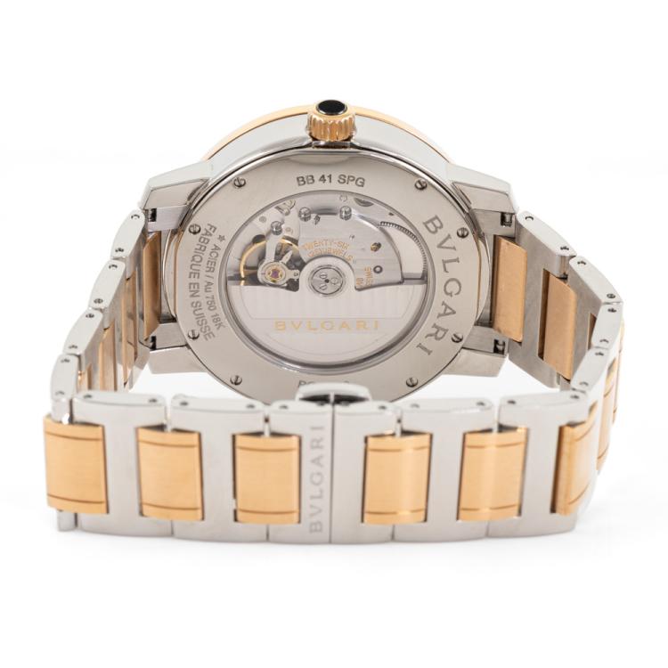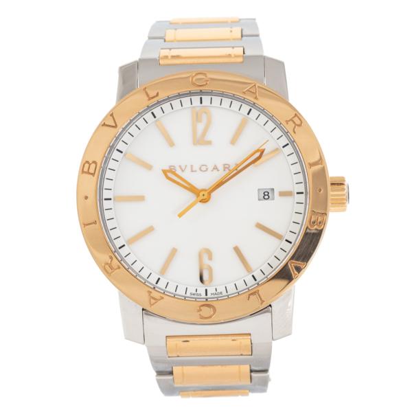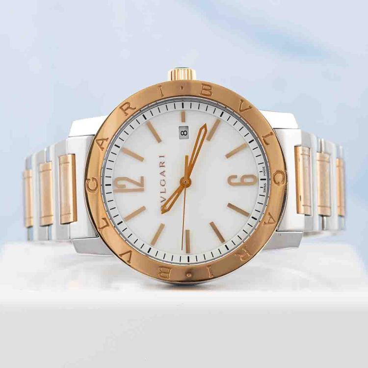 Bvlgari Bvlgari stainless steel and 18ct rose gold automatic mens watch. White dial, date, case diameter: 41mm, wrist size: 17.5cm, Swiss made. Ref# BB41SPG. With Bvlgari two-tone bracelet and clasp. With Certificate of Authenticity and Bvlgari case. 3 month FSA warranty. Pre-owned)