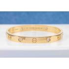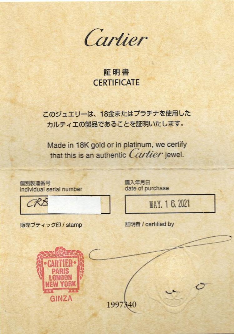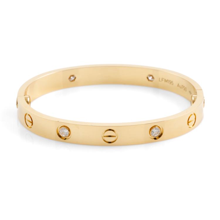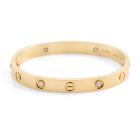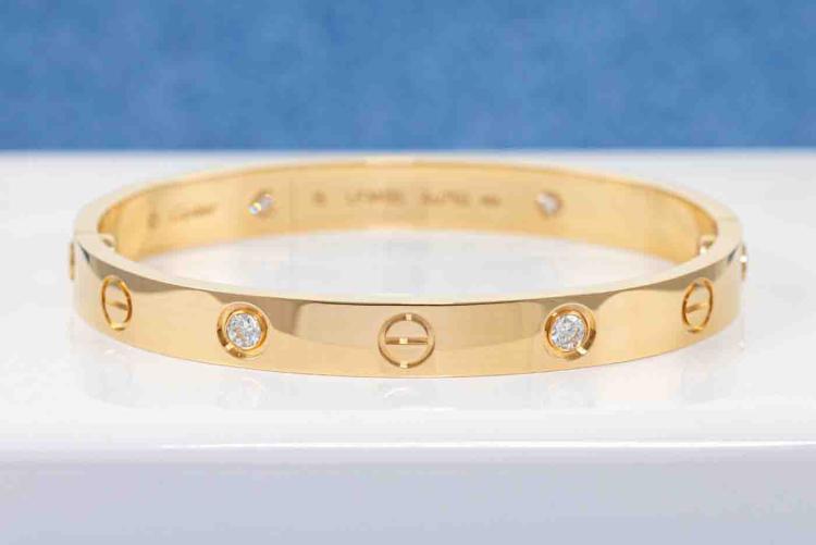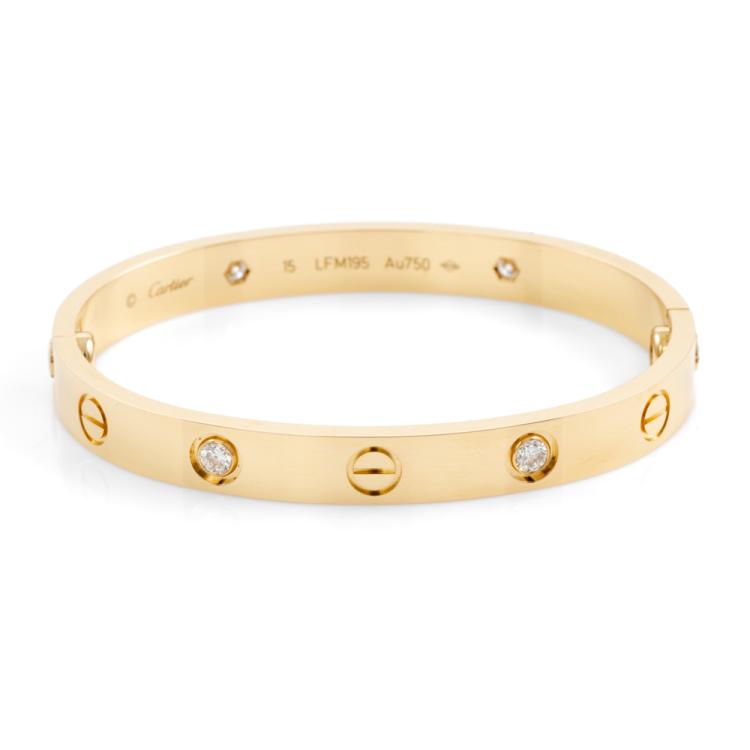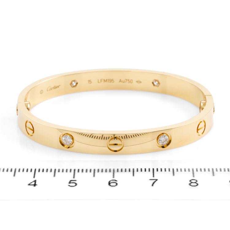 Cartier Love bracelet with 4 round natural brilliant cut Diamonds totalling approx. 0.42ct (Estimated grading: F VS). 18ct yellow gold. Cartier stamped size 15. Width: 6.1mm. Weight: 28.1g. With Cartier Certificate dated 16/05/2021, Cartier box, screwdriver and cleaning kit. (Pre-owned)