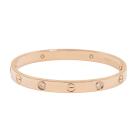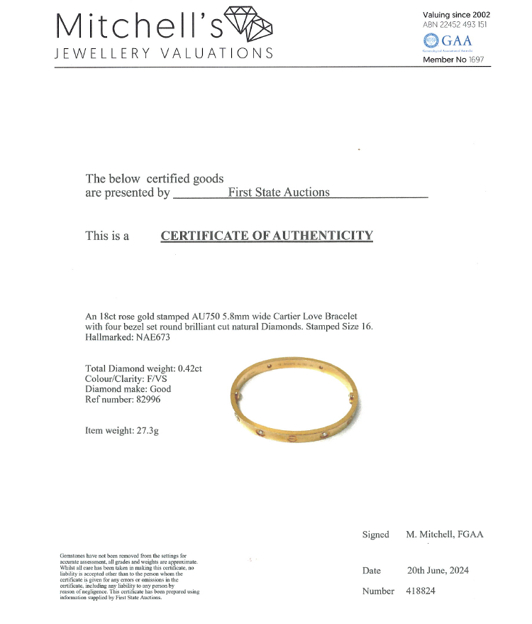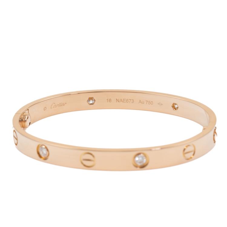 Cartier Love bracelet with 4 round natural brilliant cut Diamonds totalling 0.42ct (Estimated grading: F VS). 18ct rose gold. Cartier stamped size 16. Width: 5.8mm. Weight: 27.3g. With Certificate #418824. (Pre-owned)