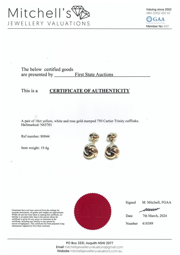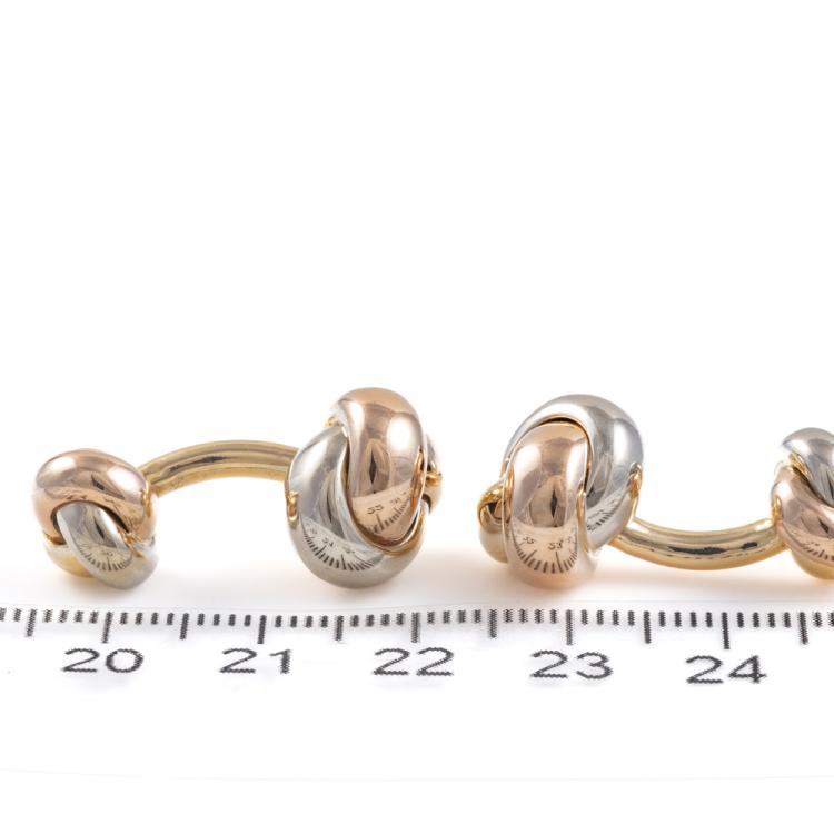 Cartier Trinity Cufflinks. 18ct yellow, white, and rose gold. The large knot measures 13.2mm in diameter and the smaller knot measures 10.2mm with a bar connecting the two. The cufflinks measure 27.0mm in length. Weight: 19.4g. With certificate #418389. (Pre-owned)