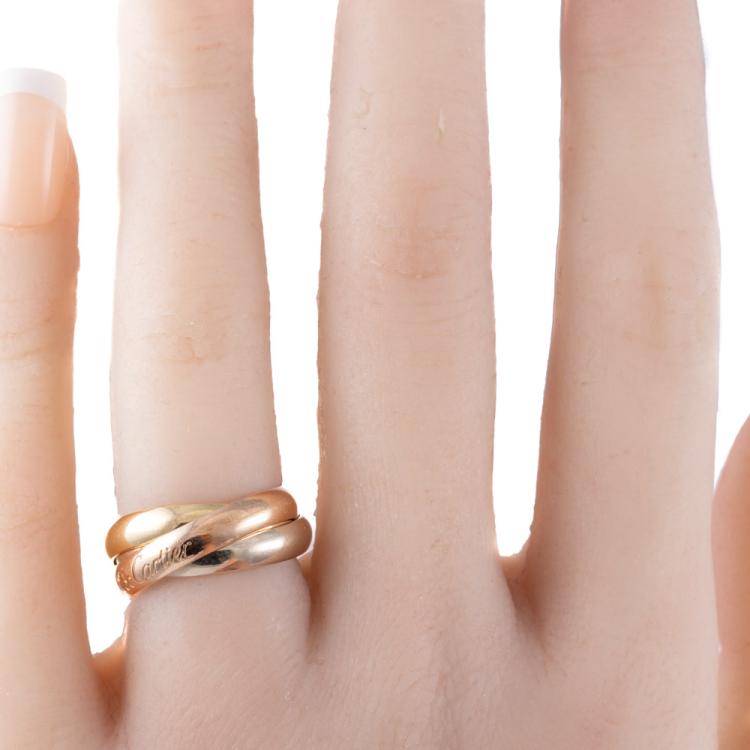 Cartier trinity ring. 18ct yellow, rose and white gold. Cartier stamped size 49, J1/2 - ring resizing is not recommended. Band width: 3.4mm. Weight: 7.2g. With Cartier box. (Pre-owned)