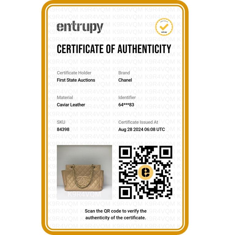 Chanel Petite Timeless tote chain bag in beige Caviar diamond-quilted leather (serial#6xxxx83). Featuring matte gold-hardware, stitched "CC" logo at front, and dual leather and chain intertwined handles. The zipper top opens to a beige fine grain leather interior with a patch and zipper pockets. Approximate dimensions: 25.5cm(L) x 19cm(H) x 14cm(D), handle drop 15cm. Accompanied by a Chanel dustbag. With Entrupy Certificate of Authenticity. (Pre-owned)