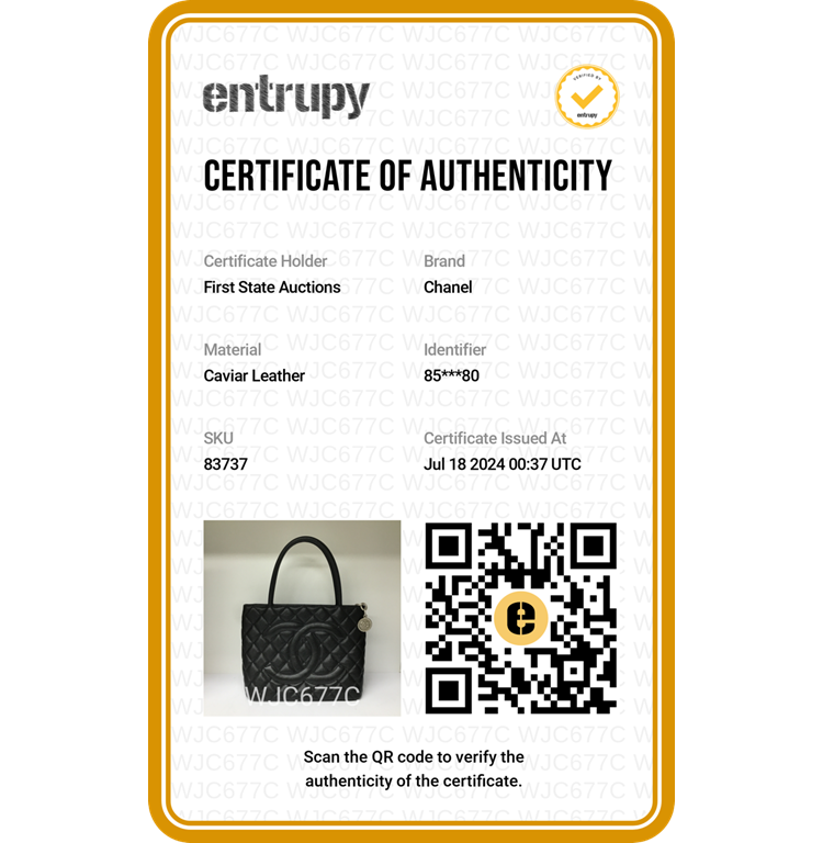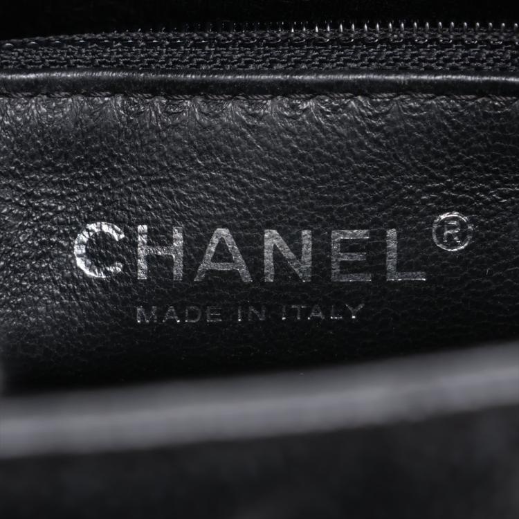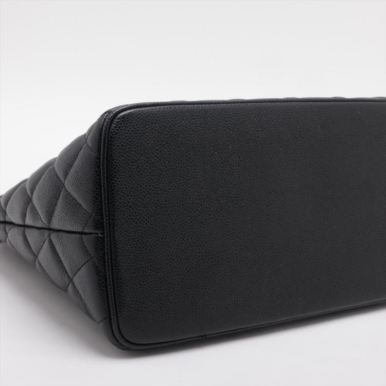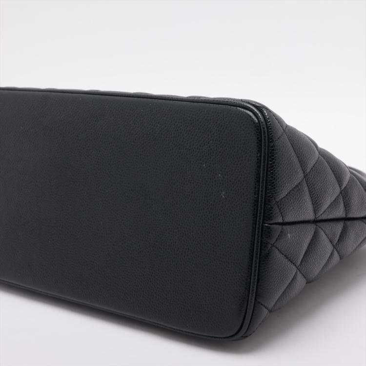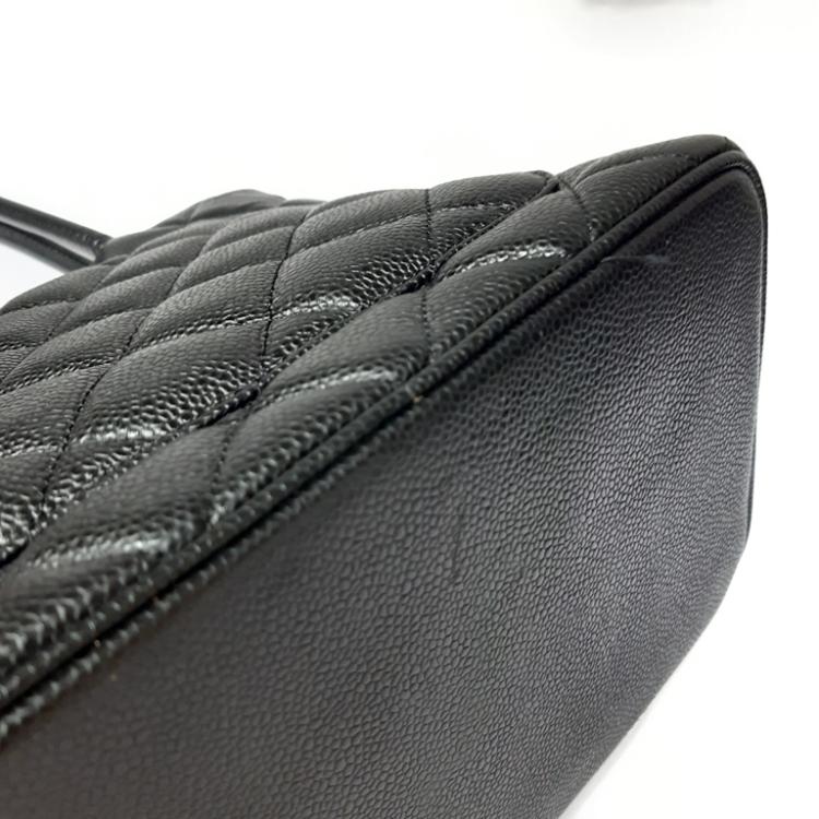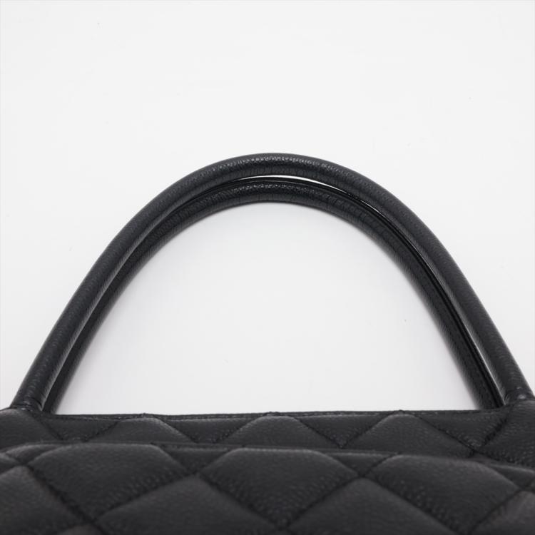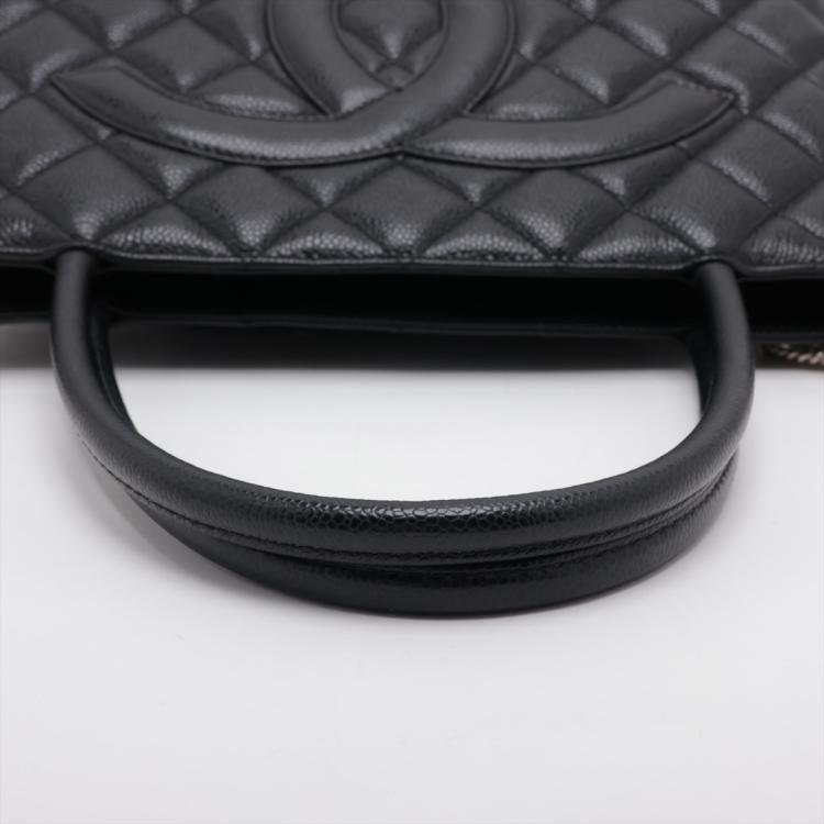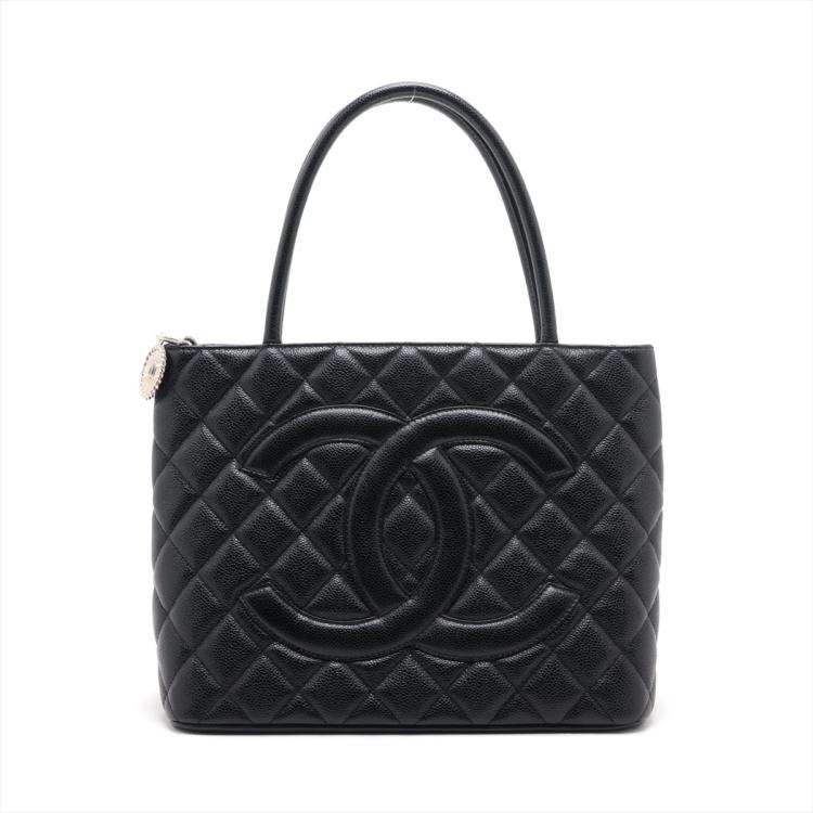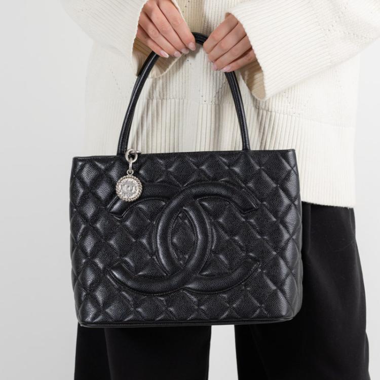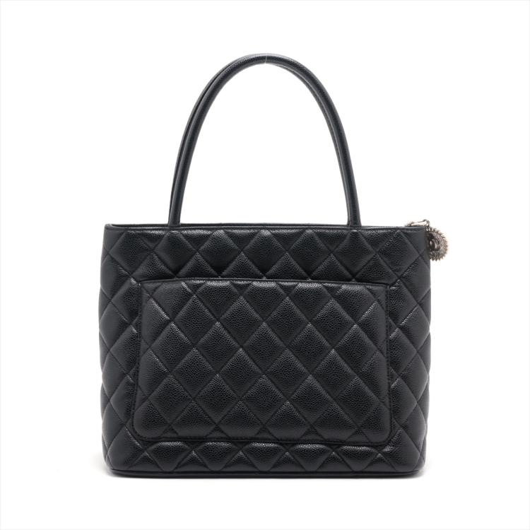 Chanel Medallion tote bag in black diamond quilted Caviar leather. Featuring silver-toned hardware, an exterior patch pocket to the back, dual leather handles, top zipper closure with a Chanel logo plate. This opens to a black leather lining interior with zipper and patch pockets. Approximate dimensions: 30cm(L) x 24cm(H) x 15cm(D), 15cm handle drop. Accompanied by a Chanel certificate card. With Entrupy Certificate of Authenticity. (Pre-owned)