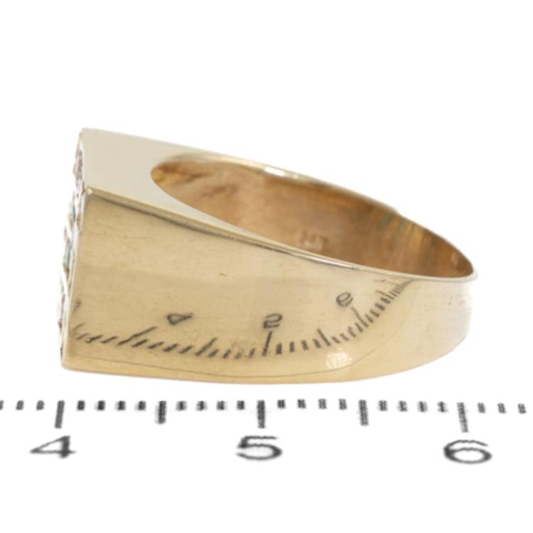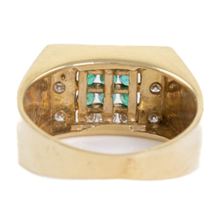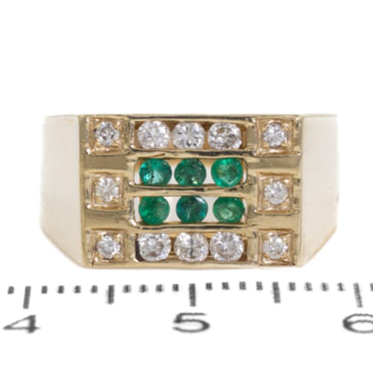 Mens ring with 6 round natural Emeralds totalling 0.22ct and round natural Diamonds totalling 0.33ct (Estimated grading: H SI-P1). 14ct yellow gold. Ring size N1/4. Band width: 3.0mm - 7.5mm. Weight: 5.2g (As New)
