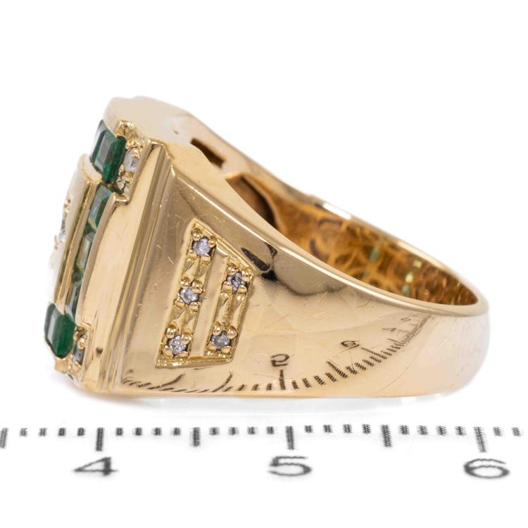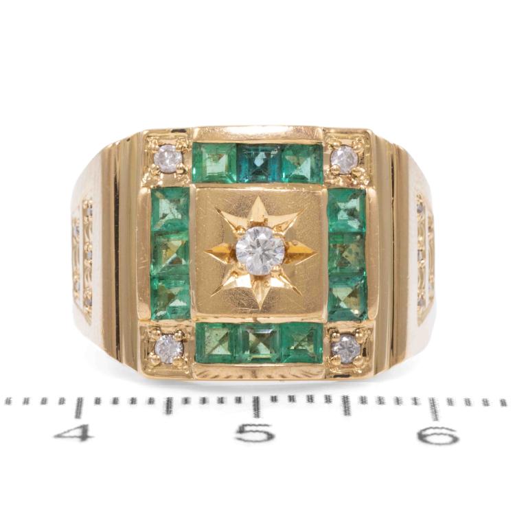 Emerald and Diamond mens ring with carre cut Natural Emeralds totalling approximated 0.54ct and round Natural Diamonds totalling 0.20ct. (estimated grading: I-J P1.) 18ct yellow gold. Ring size R. Band Width: 4.50 -5.75mm. Weight: 11.5g (pre-owned)