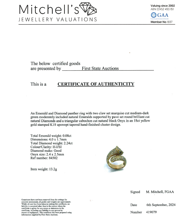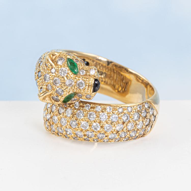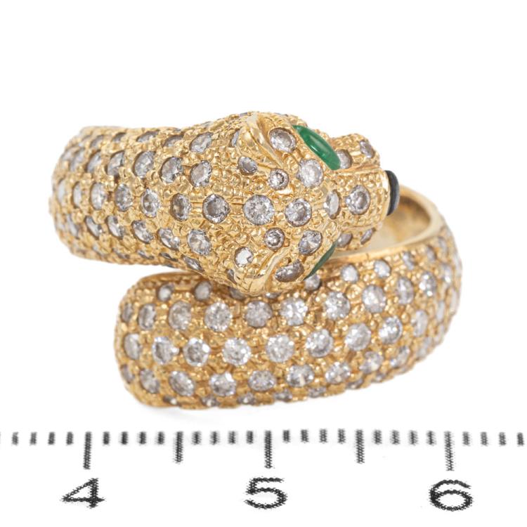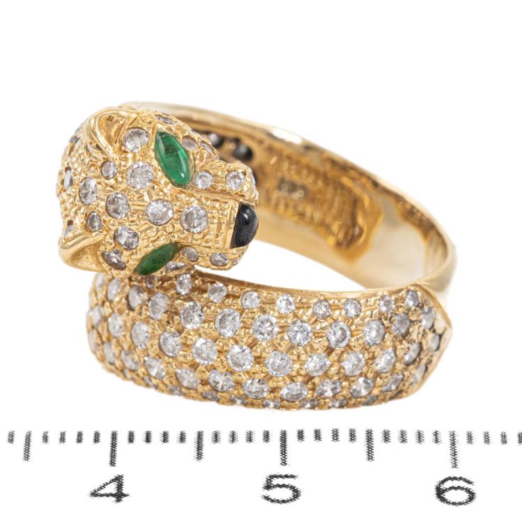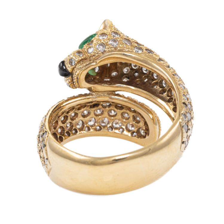 Emerald and Diamond Panther design ring with 2 marquise shape Natural Emerald totalling 0.08ct, round Natural Diamonds totalling 2.24ct (Estimated grading: H-I SI) and a triangular cabochon cut natural Onyx. 18ct yellow gold. Ring size O1/2. Band width: 7.2mm. Weight: 13.2g. With Certificate #419079. (Per-owned)