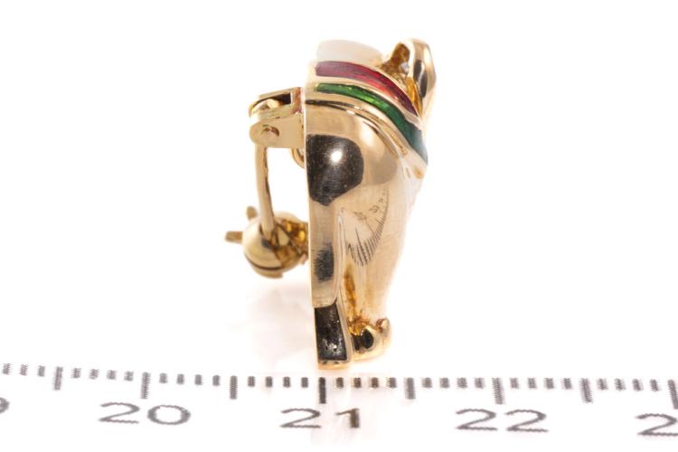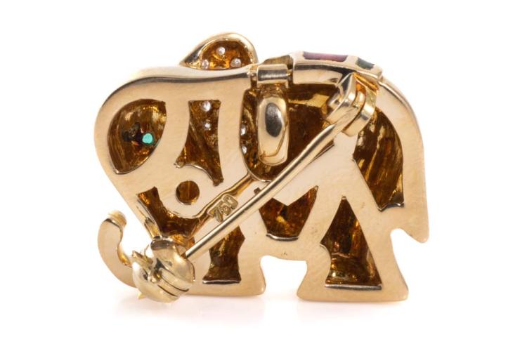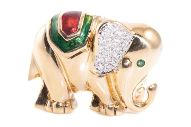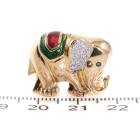 Emerald and Diamond elephant design brooch/pendant with red & green enamel, a round Natural Emerald of approximately 0.01ct and round Natural Diamonds totalling approximately 0.08ct. 18ct yellow gold. Weight: 9.5g. (Pre-owned)