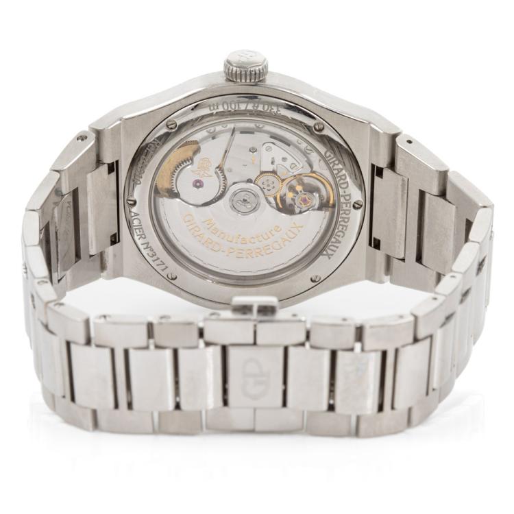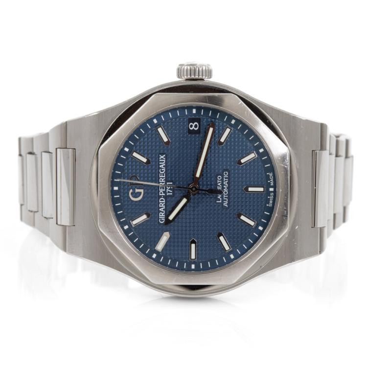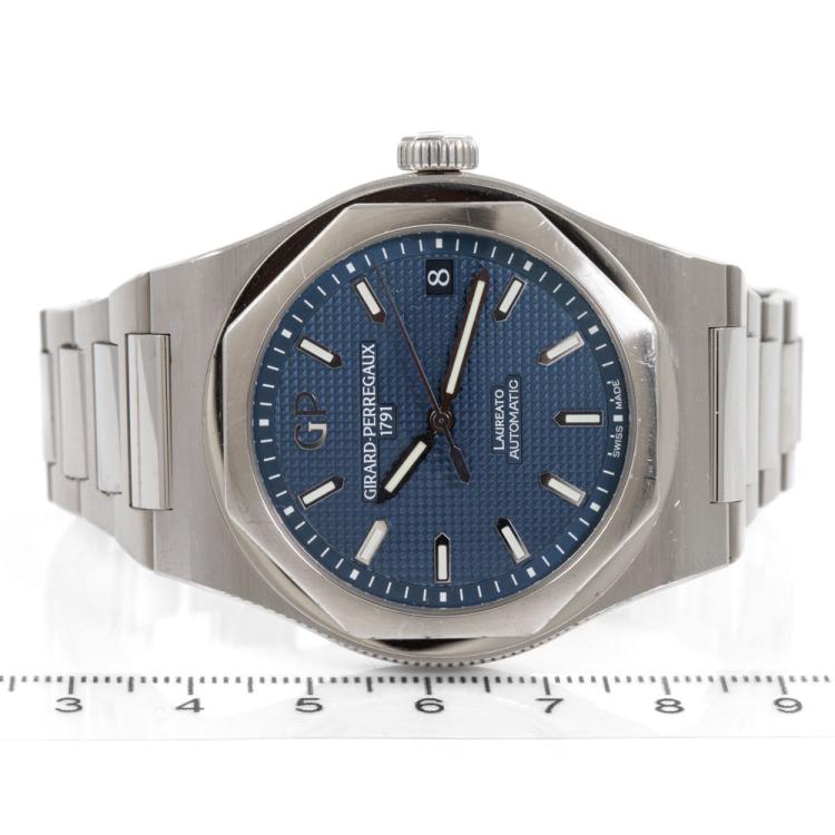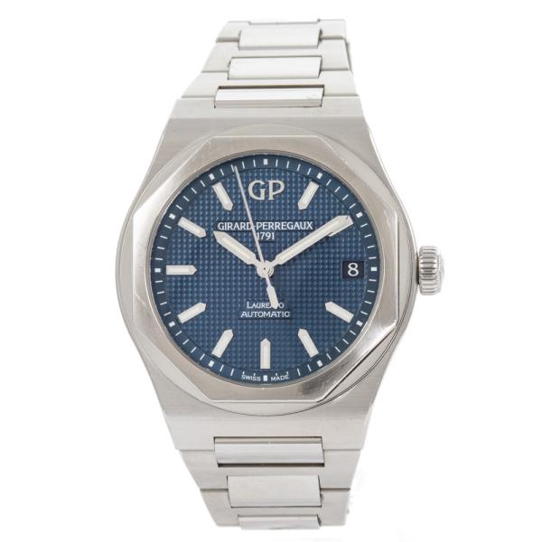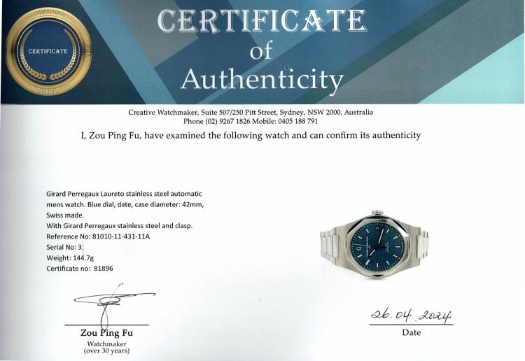Girard Perregaux Laureto stainless steel automatic mens watch. Blue dial, date, case diameter: 42mm, wrist size: 19.5cm, Swiss made. Ref# 81010-11-431-11A. With Girard Perregaux stainless steel and clasp. With Certificate of Authenticity, Girard Perregaux International Warranty card dated 03/02/2020 and Girard Perregaux box. Balance of 5 year Girard Perregaux manufacturer warranty applies. (Pre-owned)