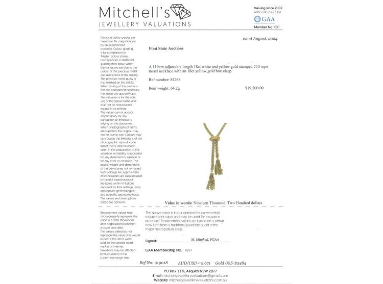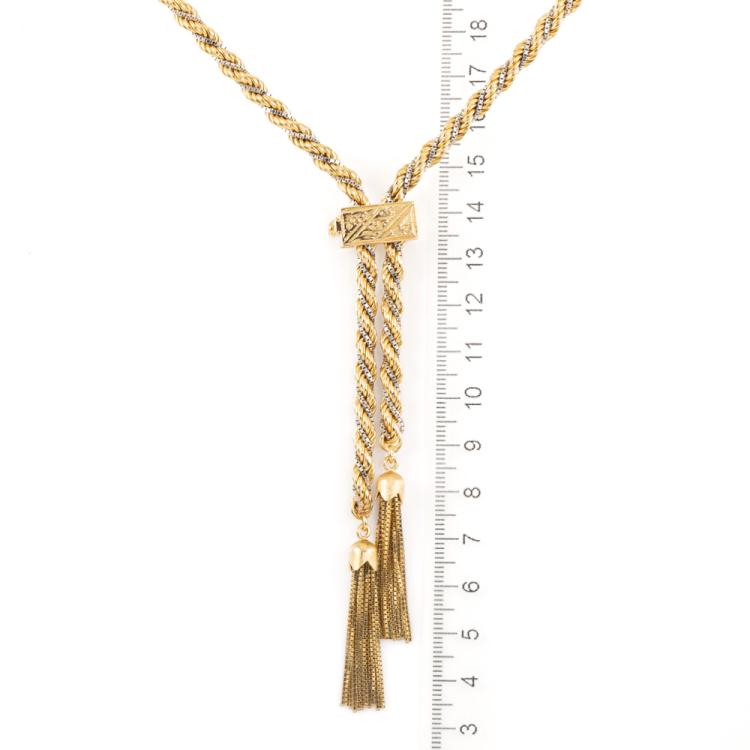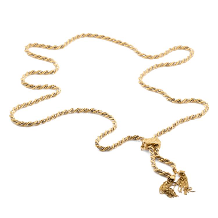 Rope necklace with tassel. 18ct yellow and white gold chain with 18ct yellow gold box clasp and 2 tassels. The maximum chain length (including tassels): 119cm and maximum wear length: 106cm. Weight: 64.2g. Note -clasp can be opened to adjust chain length. With Certificate #419018. (Pre-owned)