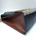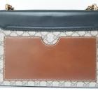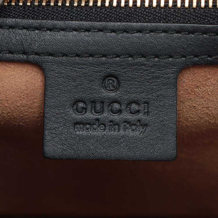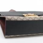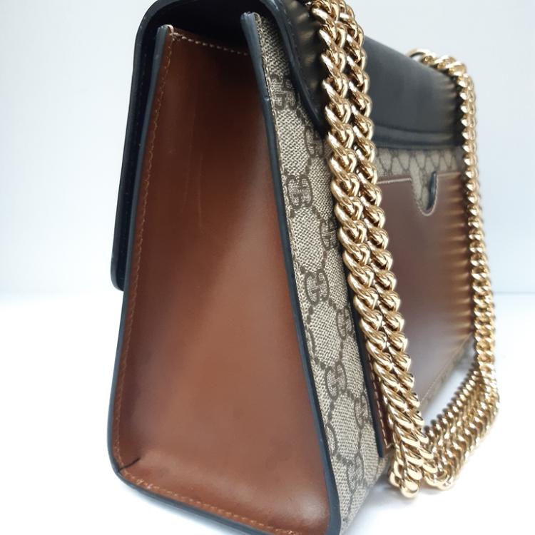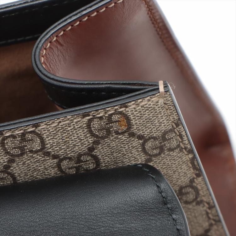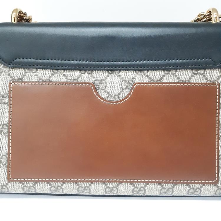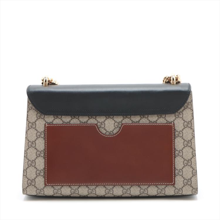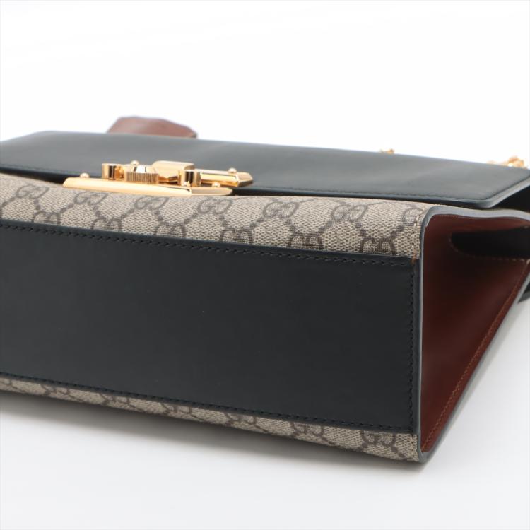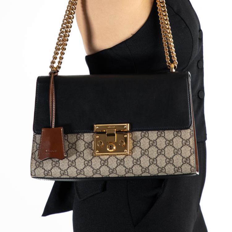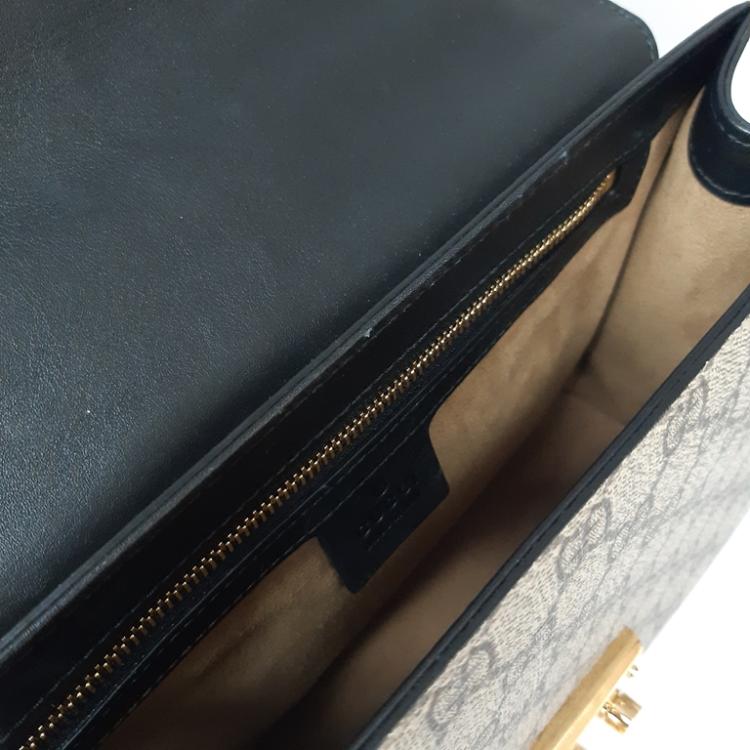 Gucci medium Supreme Padlock shoulder bag in beige GG supreme canvas and black calfskin leather. Featuring gold-toned hardware, a rear flat pocket in brown leather, and a detachable key clochette. The push-lock closure opens to a beige suede lining with a zipped pocket and card slots. Approximate dimensions: 29.5cm(L) x 18.5cm(H) x 10cm(D), strap drop 47cm. Accompanied by a Gucci dustbag. With Entrupy Certificate of Authenticity. (Pre-owned)