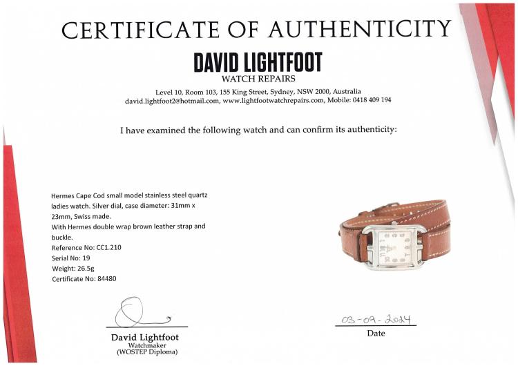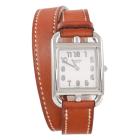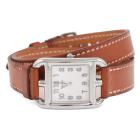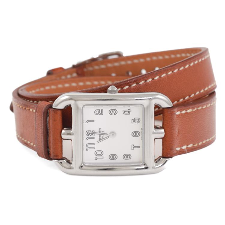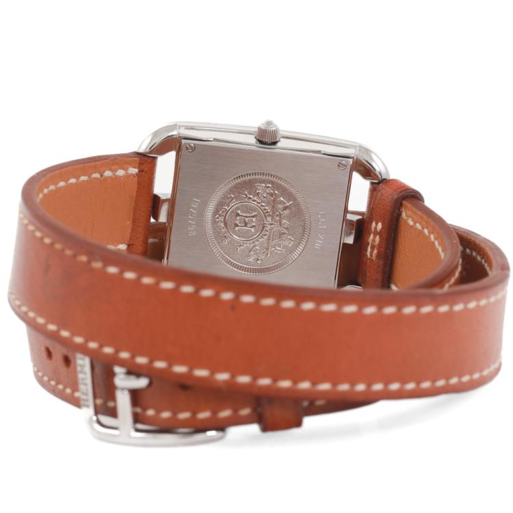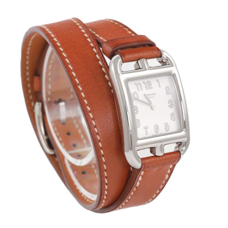 Hermes Cape Cod small model stainless steel quartz ladies watch. Silver dial, case diameter: 31mm x 23mm, strap length: 34.5cm, Swiss made. Ref# CC1.210. With Hermes double wrap brown leather strap and buckle. With Certificate of Authenticity. 3 month FSA warranty. (Pre-owned)
