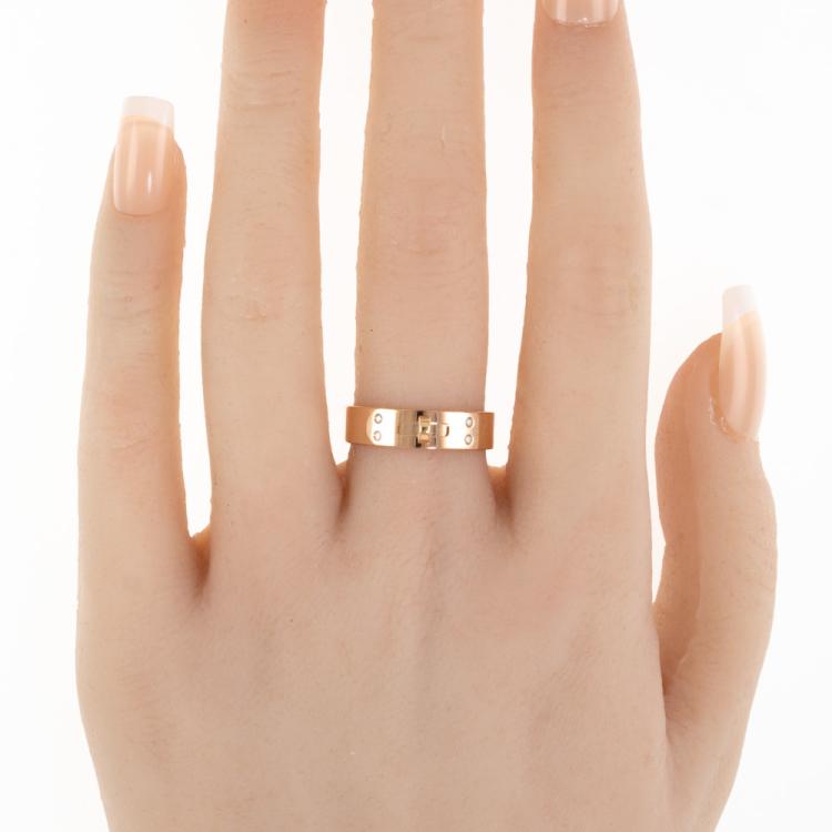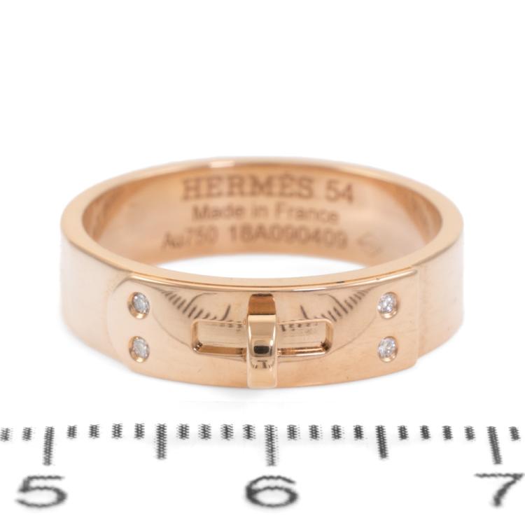 Hermes Kelly ring, small model with 4 round Natural Diamonds totalling 0.02ct. 18ct rose gold. Hermes stamped size 54, actual ring size N - ring resizing is not recommended. Width: 5mm. Made in France. Weight: 5.8g. (Pre-owned)
