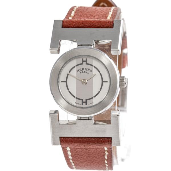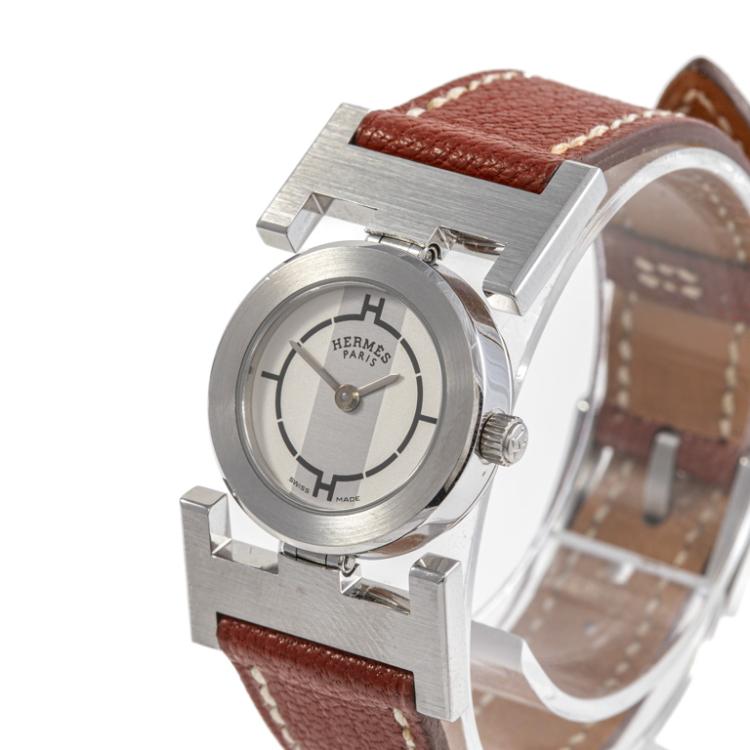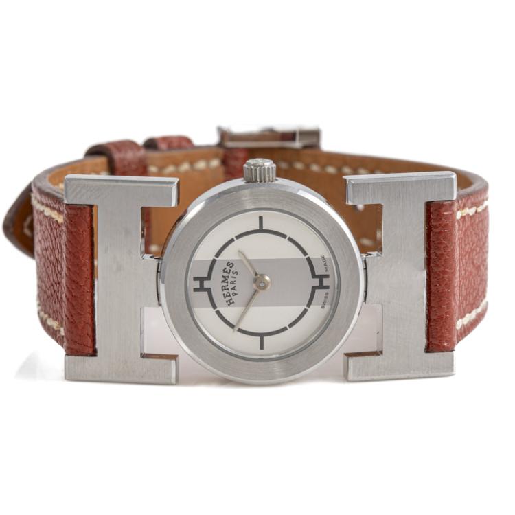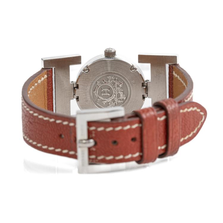 Hermes Paprika stainless steel quartz ladies watch. Silver dial, case diameter: 21mm, strap length: 16.5cm, Swiss made. Ref# PA1.210. With Hermes brown leather strap and buckle. With Certificate of Authenticity, Undated Hermes Certificate of Origin & Guarantee booklet and Hermes box. 3 month FSA warranty (Pre-owned)