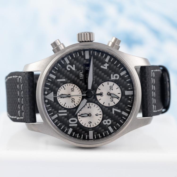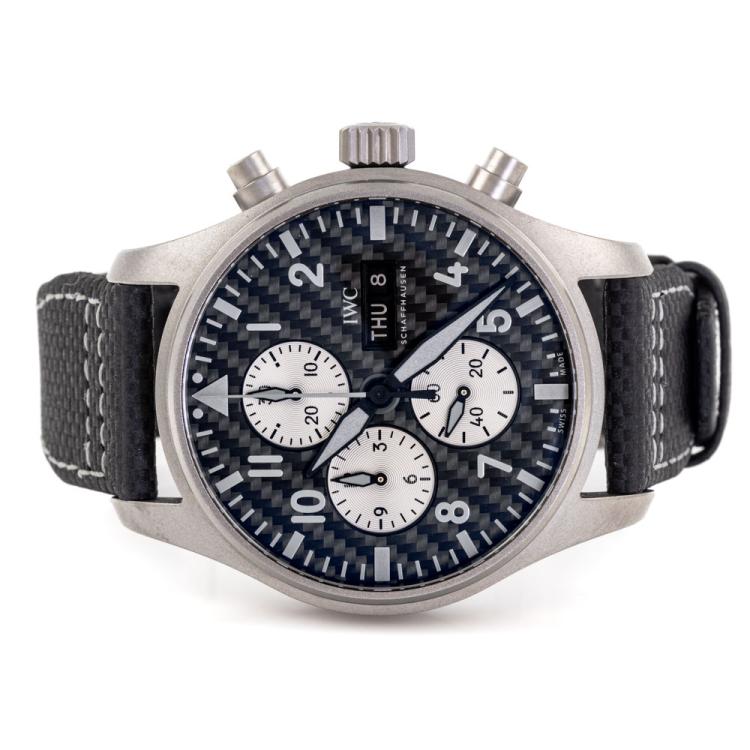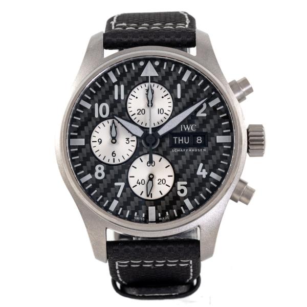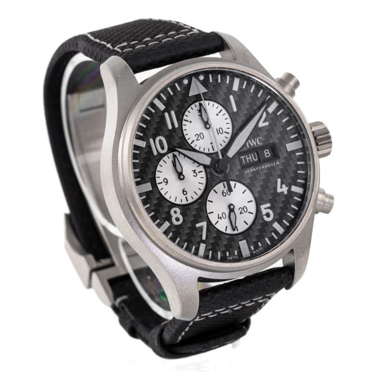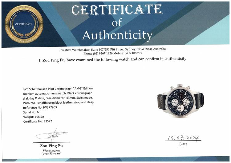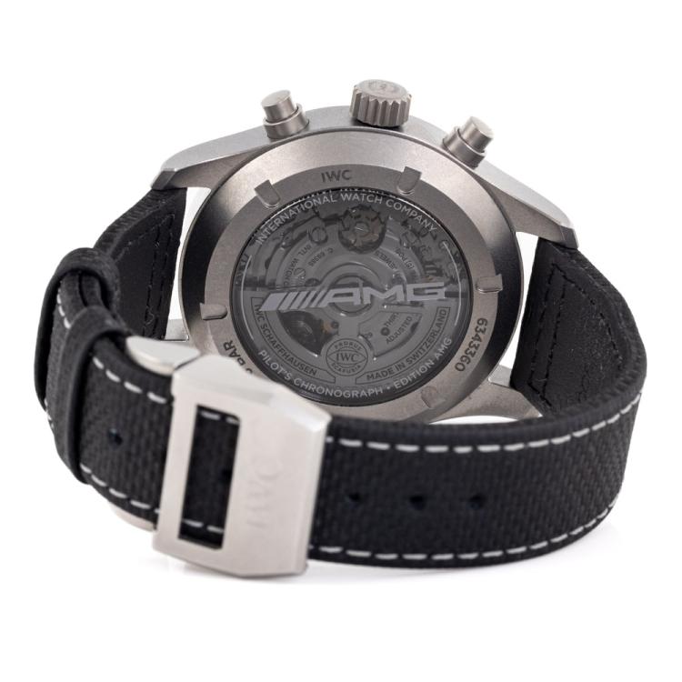 IWC Schaffhausen Pilot Chronograph "AMG" Edition titanium automatic mens watch. Black chronograph dial, day & date, case diameter: 43mm, adjustable max wrist size: 19cm, Swiss made. Ref# IW377903. With IWC Schaffhausen black leather strap and clasp. With Certificate of Authenticity, IWC Schaffhausen International Limited Warranty card dated 29/07/2022 and IWC Schaffhausen box. 3 month FSA warranty. (Pre-owned)