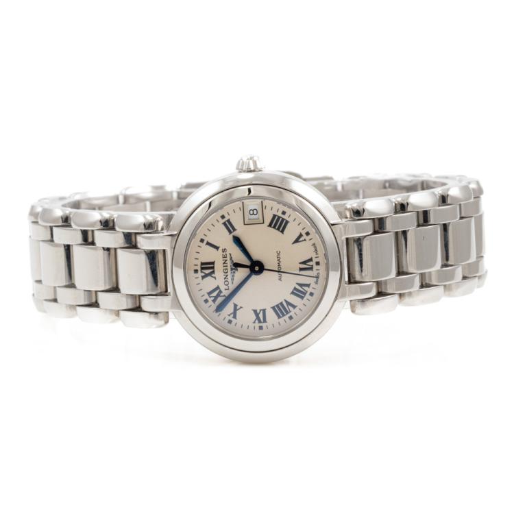 Longines Primaluna stainless steel automatic ladies watch. Silver dial, date, case diameter: 26.5mm, wrist size: 16.5cm, Swiss made. Ref# L8.111.4.71.6. With Longines stainless steel bracelet and clasp. With FSA Certificate of Authenticity and Longines box. 3 month FSA warranty (As new, Note: minor scratch on case and bracelet due to being display stock)
