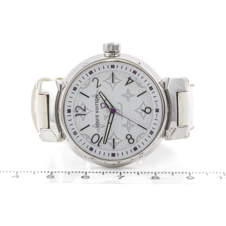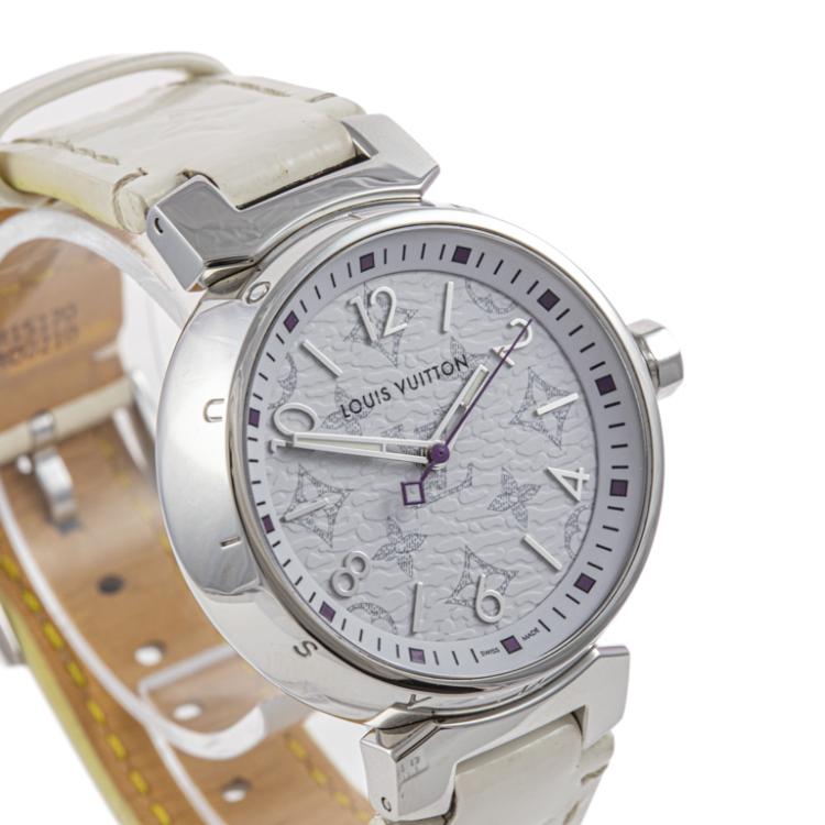 Louis Vuitton Tambour stainless steel quartz ladies watch. White monogram dial, case diameter: 34mm, strap length: 18cm, Swiss made. Ref# QA116. With Louis Vuitton white leather strap and buckle. With Certificate of Authenticity, Louis Vuitton International Guarantee Booklet dated 11/01/2020 and Louis Vuitton box. 3 month FSA warranty. (Pre-owned)