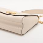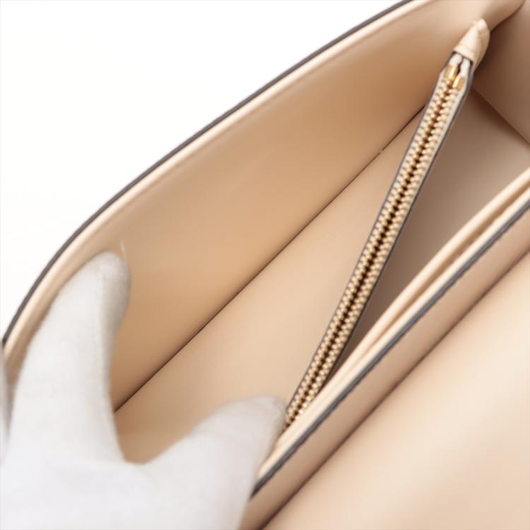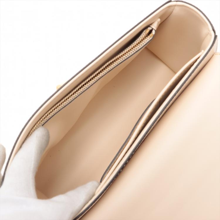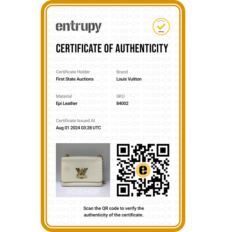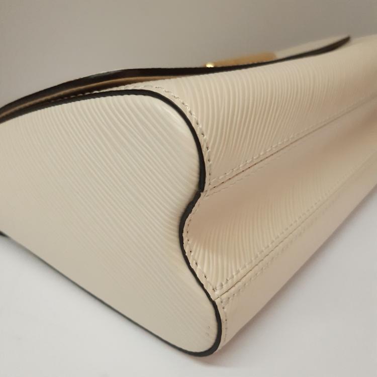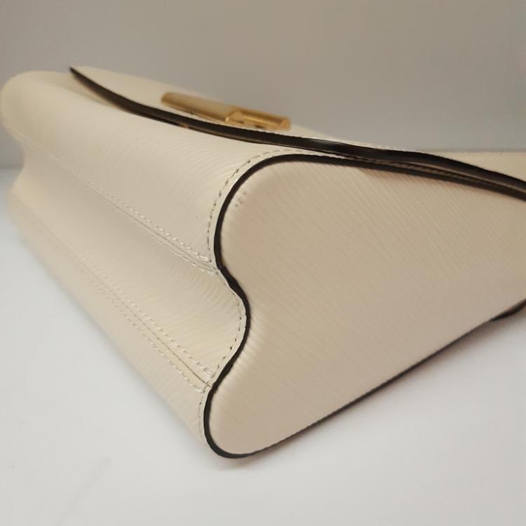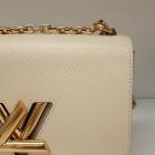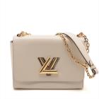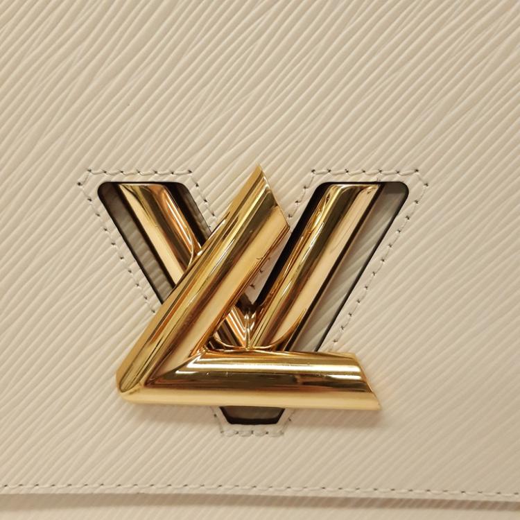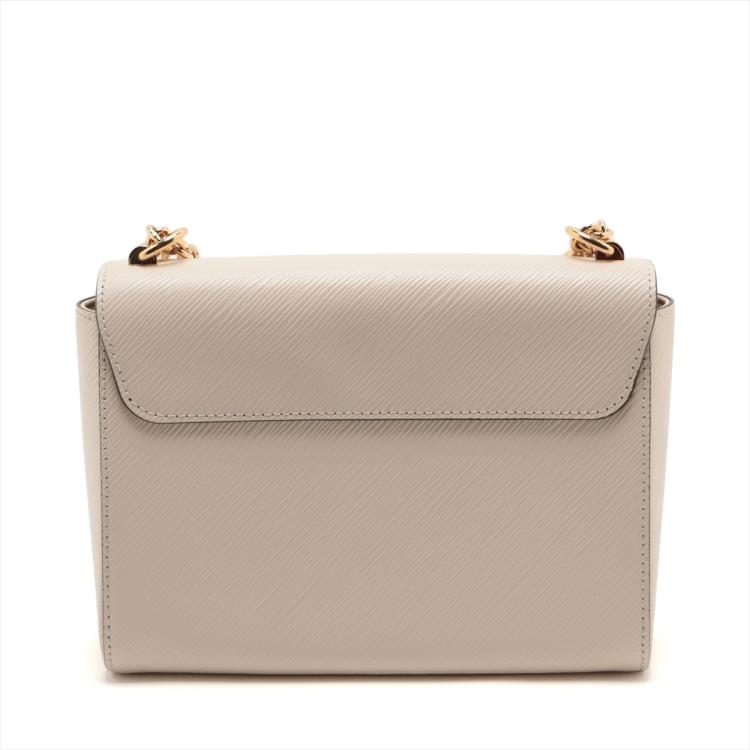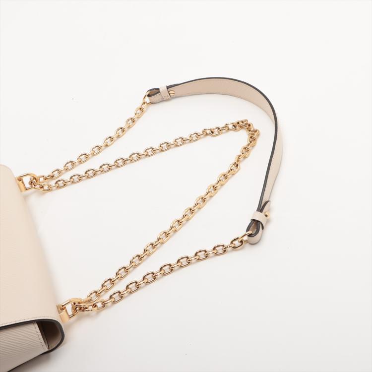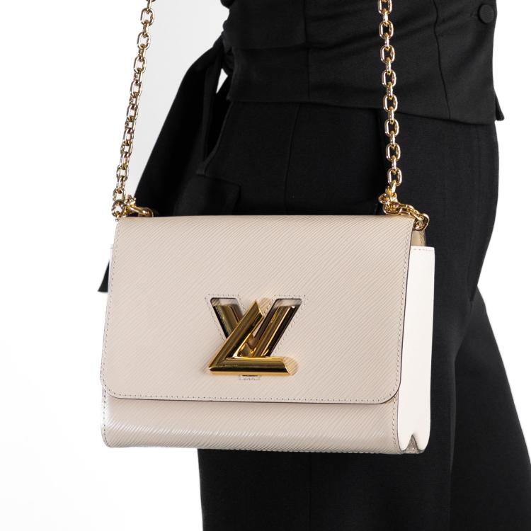 Louis Vuitton Twist MM in Quartz white Epi leather. Featuring gold-toned hardware, a sliding chain-leather strap to convert from shoulder carry to cross body wear. The front flap with LV twist lock opens to a beige smooth leather lining interior with patch and zipper pockets, and a card slot. Approximate dimensions: 23cm(L) x 17.5cm(H) x 9cm(D), 32-56cm shoulder drop. Accompanied by a mirror. With Entrupy Certificate of Authenticity. (Pre-owned)