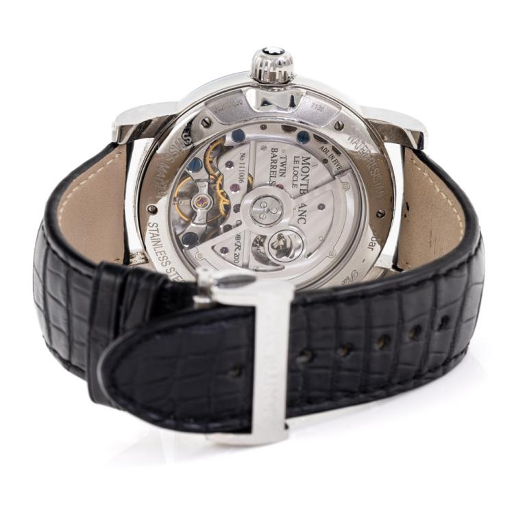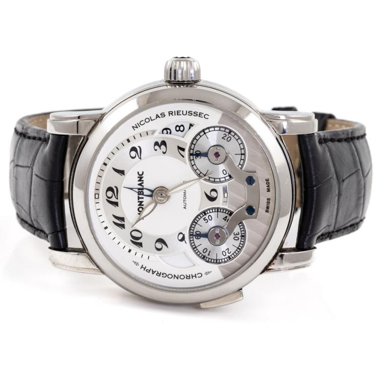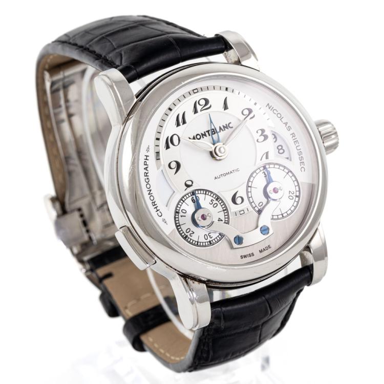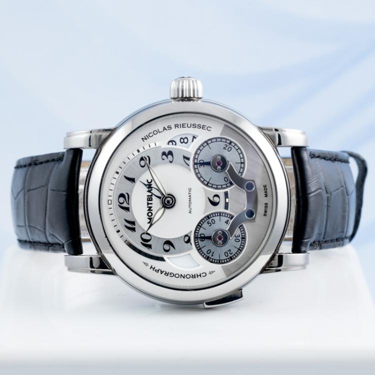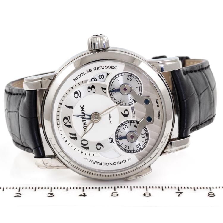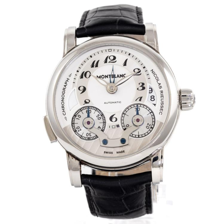 Montblanc Nicolas Rieussec stainless steel automatic mens watch. Silver chronograph dial, date, case diameter: 43mm, adjustable max wrist size: 18cm, Swiss made. Ref# 106595. With Montblanc black leather strap and clasp. With Certificate of Authenticity, Montblanc International Guarantee Certificate booklet dated 08/03/2014 and Montblanc box. 3 month FSA warranty (Pre-owned)