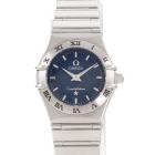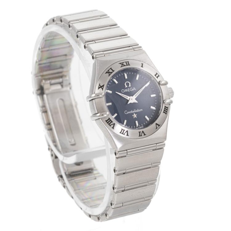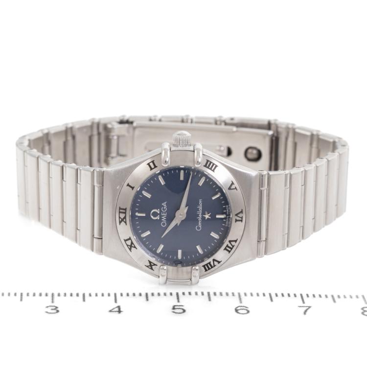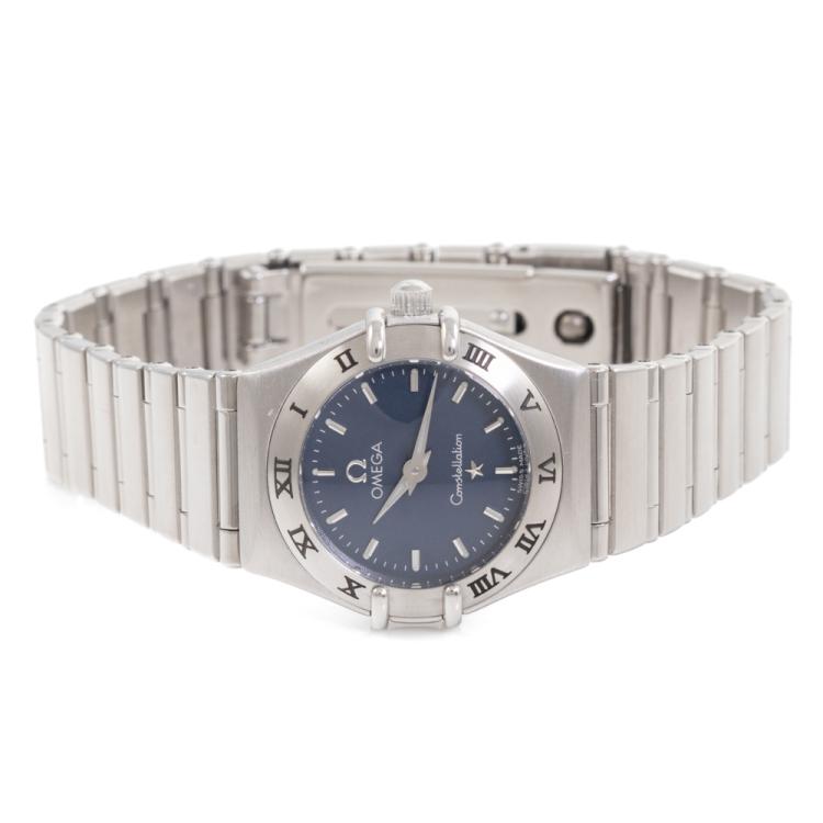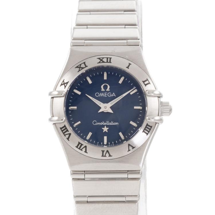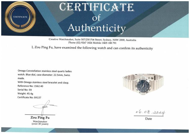 Omega Constellation stainless steel quartz ladies watch. Blue dial, case diameter: 22.5mm, wrist size: 16cm, Swiss made. Ref# 1562.40. With Omega stainless steel bracelet and clasp. With Certificate of Authenticity and Omega box. 3 month FSA warranty (Pre-owned)